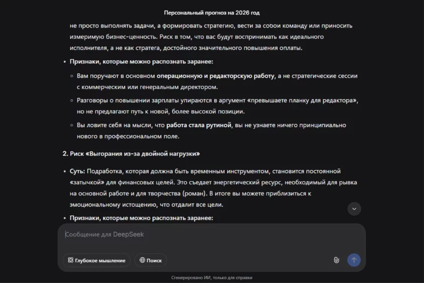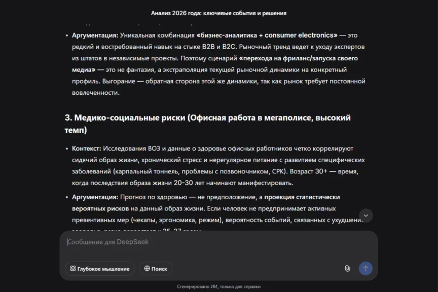 В этом эксперименте DeepSeek четко попал в наши вводные и выдал не просто общий текст, а «карту» с рисками, ранними признаками и действиями. По стилю это более мотивирующий ответ, чем у ChatGPT: меньше цифр, больше рамок и смыслов, но при этом шаги вполне прикладные.