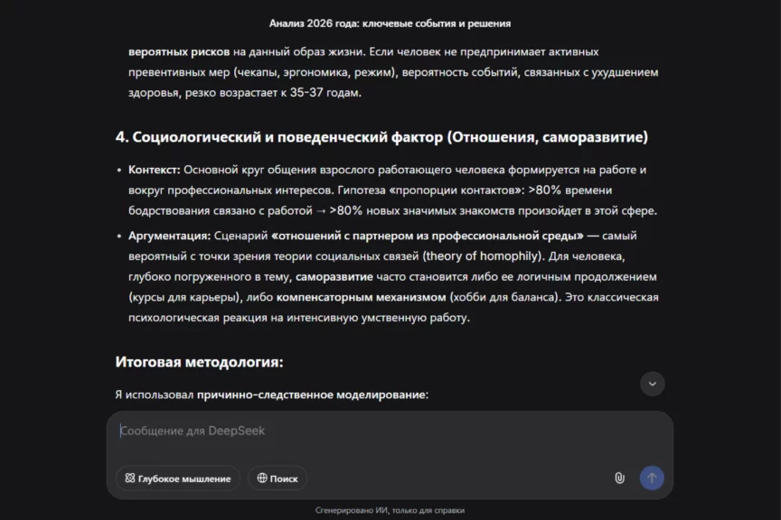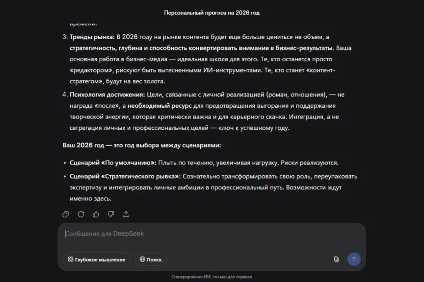 Посмотрим, какой сценарий на 2026 год составит бесплатный китайский алгоритм. Мы ввели тот же запрос, что и для ChatGPT, без конкретики. Ради интереса добавили новую переменную — включили режим размышлений.