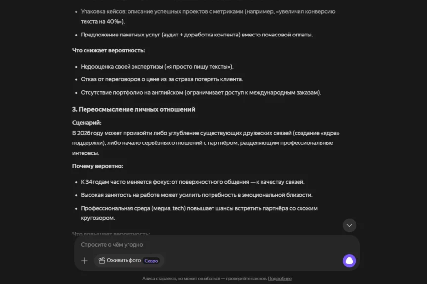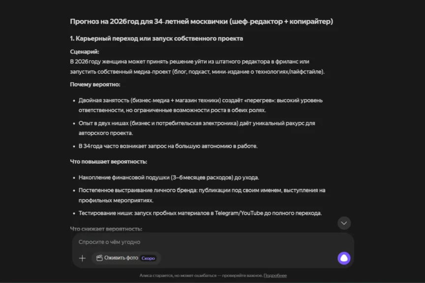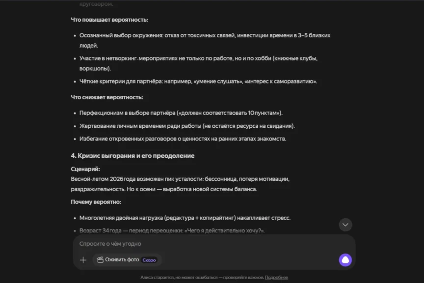 По сравнению с DeepSeek Алиса менее «философична», а ее ответы больше похожи на консультации: пять сценариев с причинами и действиями, без длинных рассуждений о методе в теле прогноза. Самые сильные блоки — карьера/деньги и саморазвитие: там много конкретных рычагов (личный бренд, тест ниши, пакетные услуги, 2 часа в неделю на инструменты). Слабее всего раскрыто здоровье: снова почти целиком про выгорание и баланс, без разбора сидячих рисков, как у DeepSeek.
