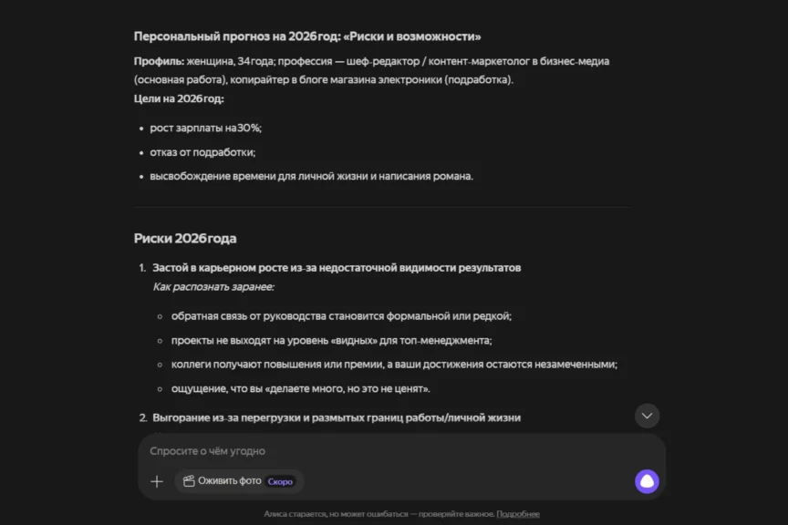 И в завершение важный момент: чтобы получить результат, который будет выглядеть как план на 2026 год, дайте нейросети максимум информации о себе. Или добавьте в каждый промпт строку: «При необходимости задавай наводящие вопросы», чтобы ИИ уточнил информацию о вас. Так алгоритмы смогут написать наиболее вероятные сценарии.