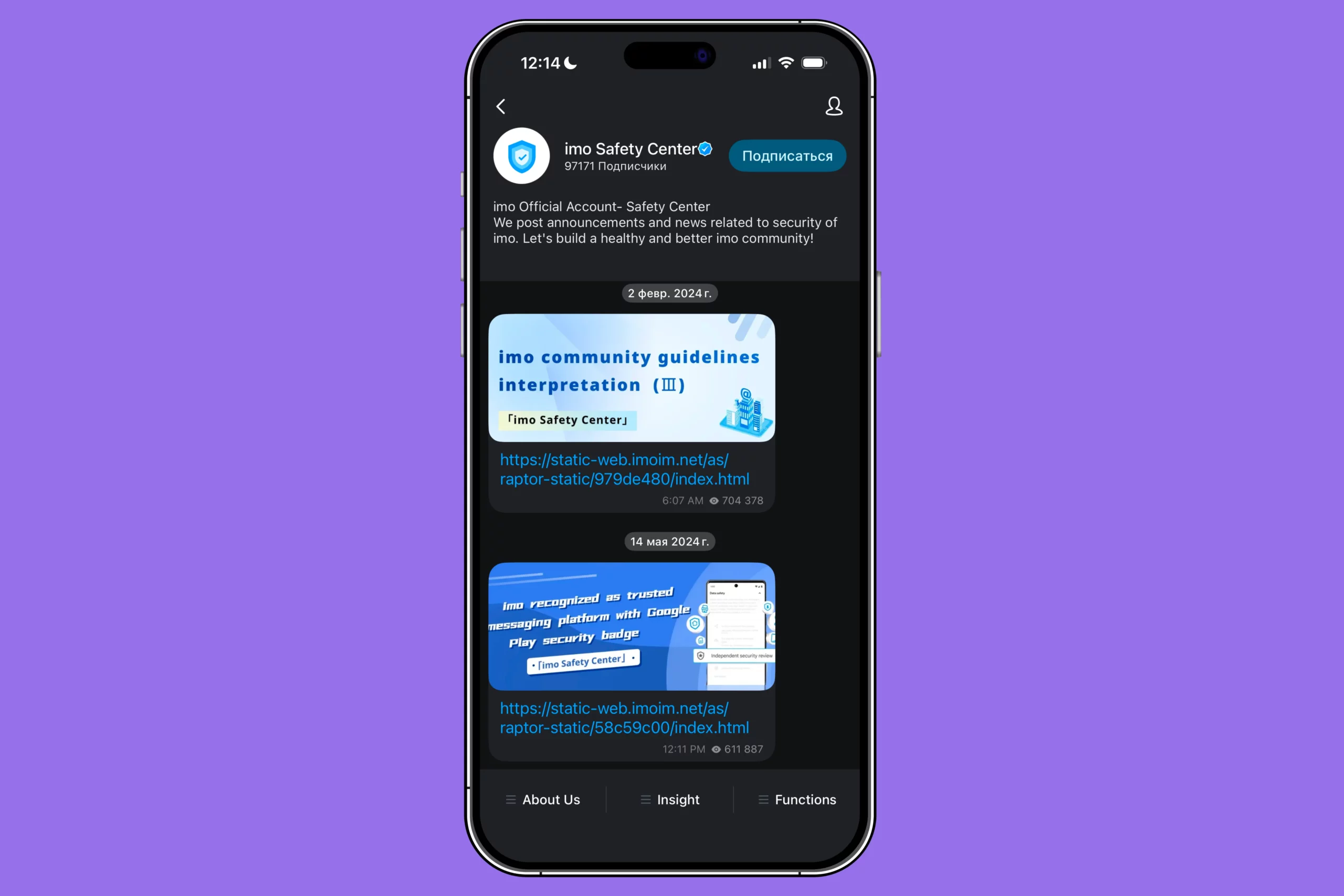 Если вы создали канал, в него можно добавить собственные кнопки меню. Например, у официального канала мессенджера есть три раздела: «О нас» (About Us), «Отчеты» (Insight), «Возможности» (Functions). Хотя интерфейс мессенджера полностью переведен на русский, текст кнопок автоматически не переводится.
