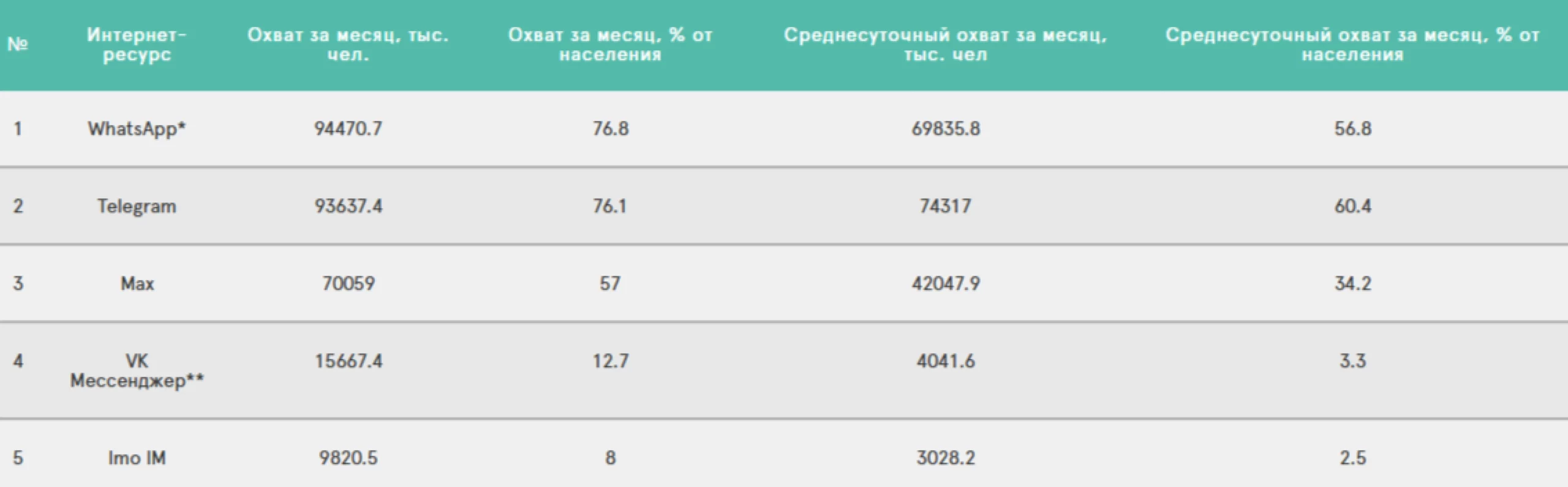 Чтобы получить эту таблицу на сайте Mediascope, кликните на вкладку «Интернет», выберите Россию, декабрь 2025 года, целевую аудиторию 12+ и «Мессенджеры»