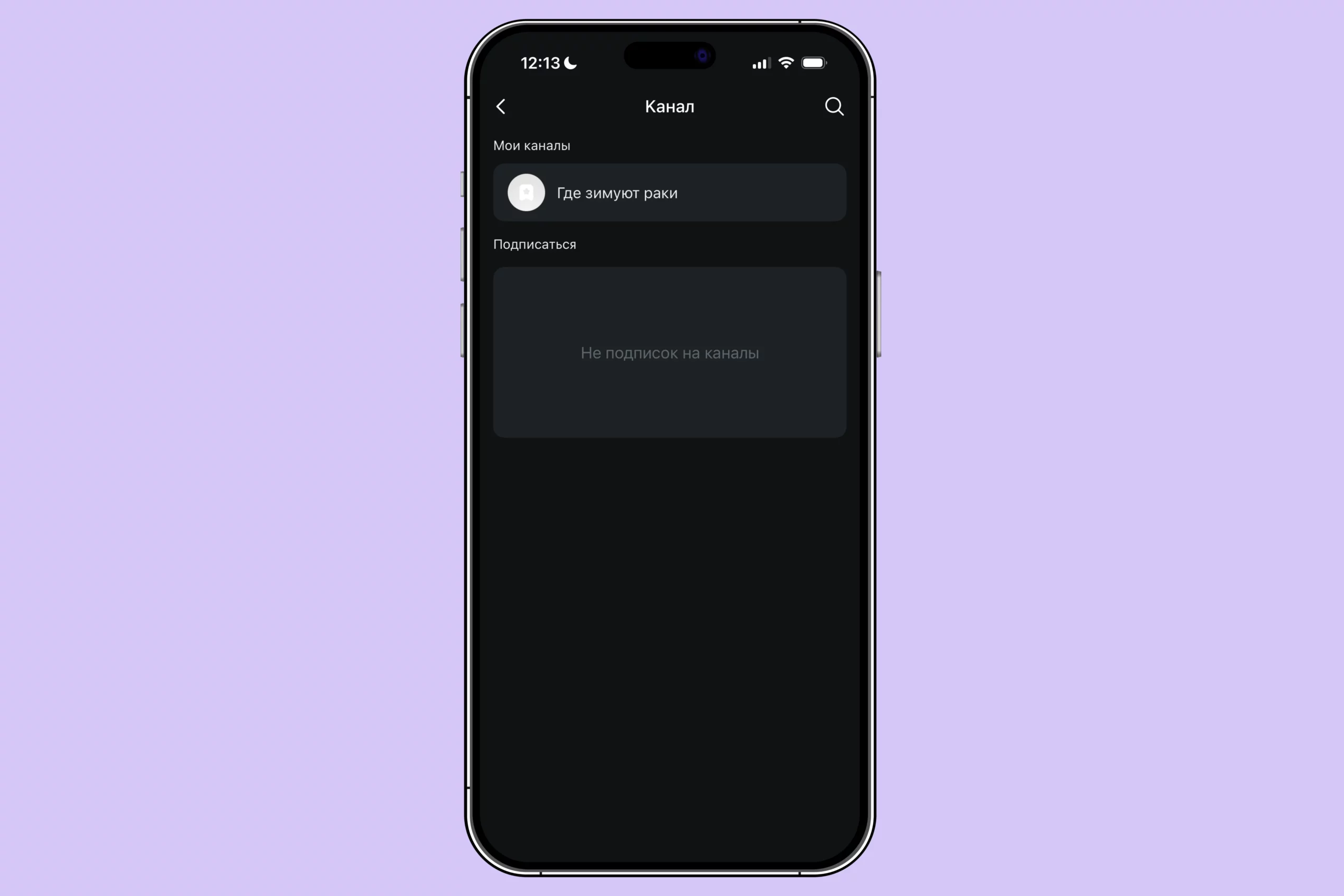 - создайте собственный канал или кликните на лупу, чтобы найти что-то интересное.