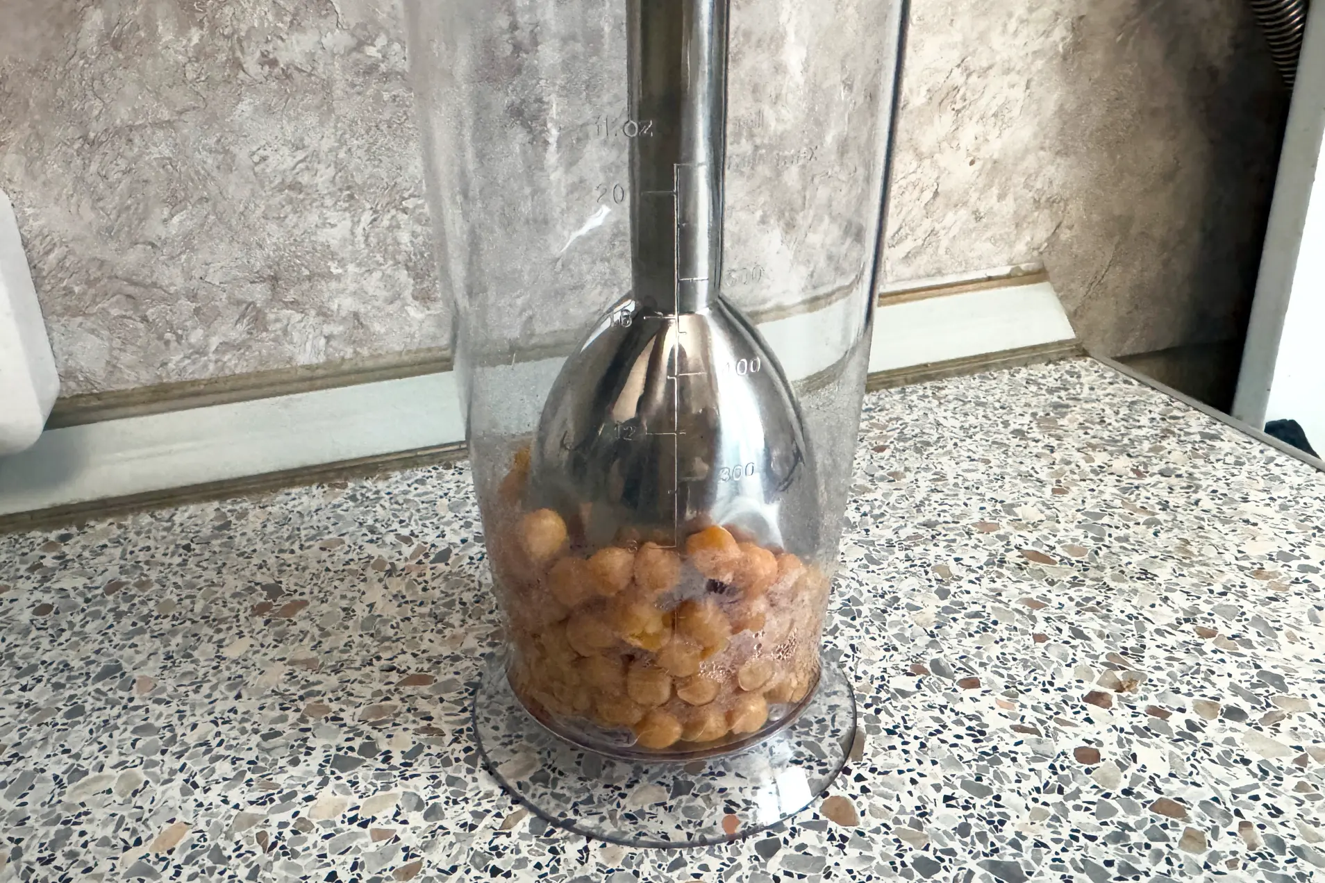 Будем пользоваться погружной насадкой и чашей из комплекта — она достаточно высокая, чтобы не испачкать кухню в процессе измельчения, и вполне вместительная, так что готового хумуса хватит на двоих.