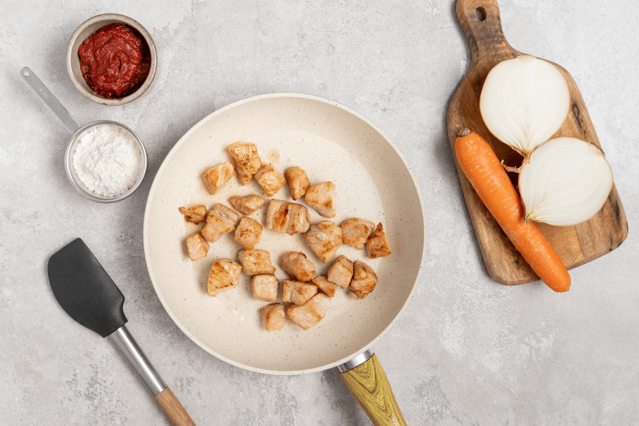 Шаг 1. Мясо промойте и при необходимости очистите от пленок. Нарежьте средними кусочками. Обжарьте на сильно разогретой сковороде, пока оно не побелеет со всех сторон или до легкой золотистости. Для этого блюда лучше всего выбрать нежирную мякоть, но по большому счету подойдет любая часть туши.
