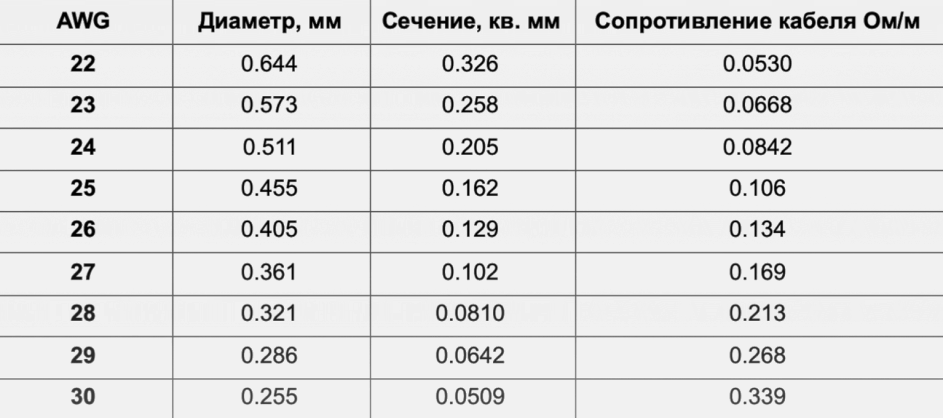 Такое «перевернутое» обозначение диаметра сложилось исторически: проволока изготавливается посредством волочения, при этом номер (калибр) обозначает количество последовательных протягиваний заготовки через все уменьшающиеся отверстия в волоке вплоть до получения нужного диаметра. В общем, запомните: чем меньше параметр AWG, тем больше толщина кабеля и тем он в теории может быть длиннее.