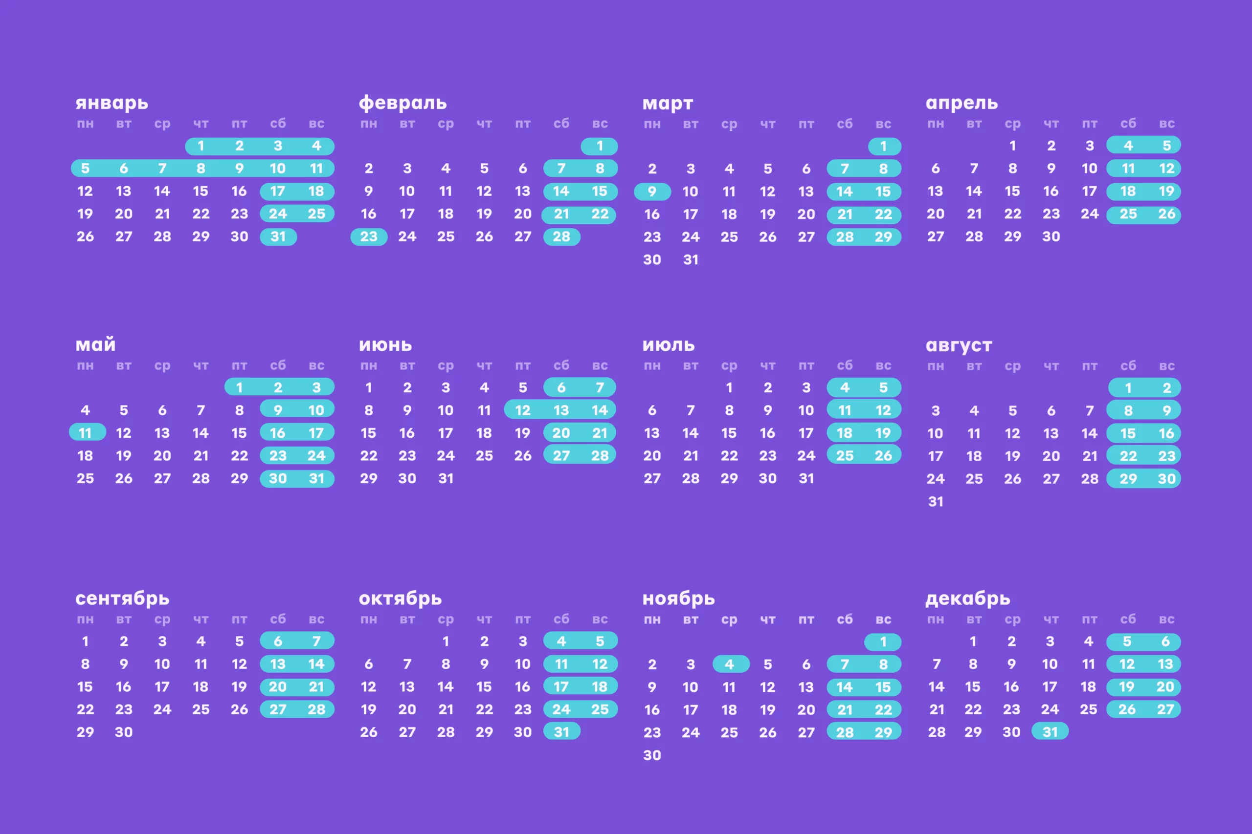 - июль — в нем 23 рабочих дня, 8 выходных и нет государственных праздников;