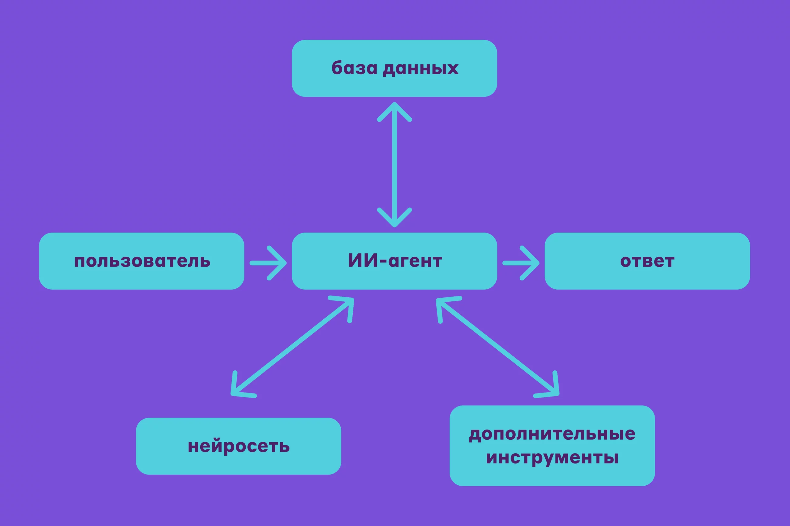 Дальше включается память: кратковременная и долговременная (по сути это простая база данных) — к ней агент возвращается за дополнительным контекстом. Есть языковая модель (LLM), то есть «мозг», с помощью которого ИИ принимает решение. И еще два модуля: планирования и решения. Первый разбивает запрос на конкретные задачи. Второй отвечает за инструменты, которыми нужно воспользоваться для решения.