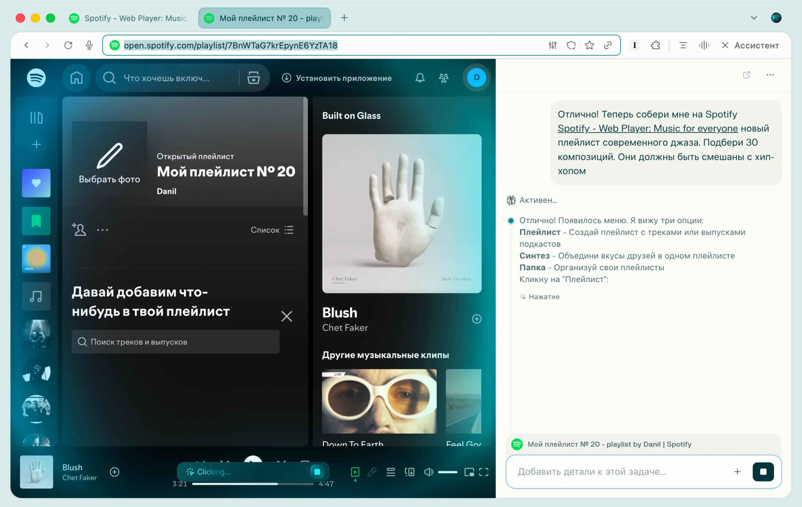 Вот простой пример из жизни. В какой-то момент я так устал от музыки, которую мне рекомендуют Spotify и «Яндекс», что решил собрать собственные плейлисты классической музыки и джаза. Я ничего о них не знаю. Поэтому я попросил Perplexity помочь мне с изучением разных течений в музыке. После этого я попросил того же агента в браузере Comet зайти на сайт Spotify и собрать мне их. Агент сам зашел на сайт, создал плейлист, нашел все треки, добавил их в плейлист, создал обложку и добавил в специальную папку. Пара минут — и все готово.