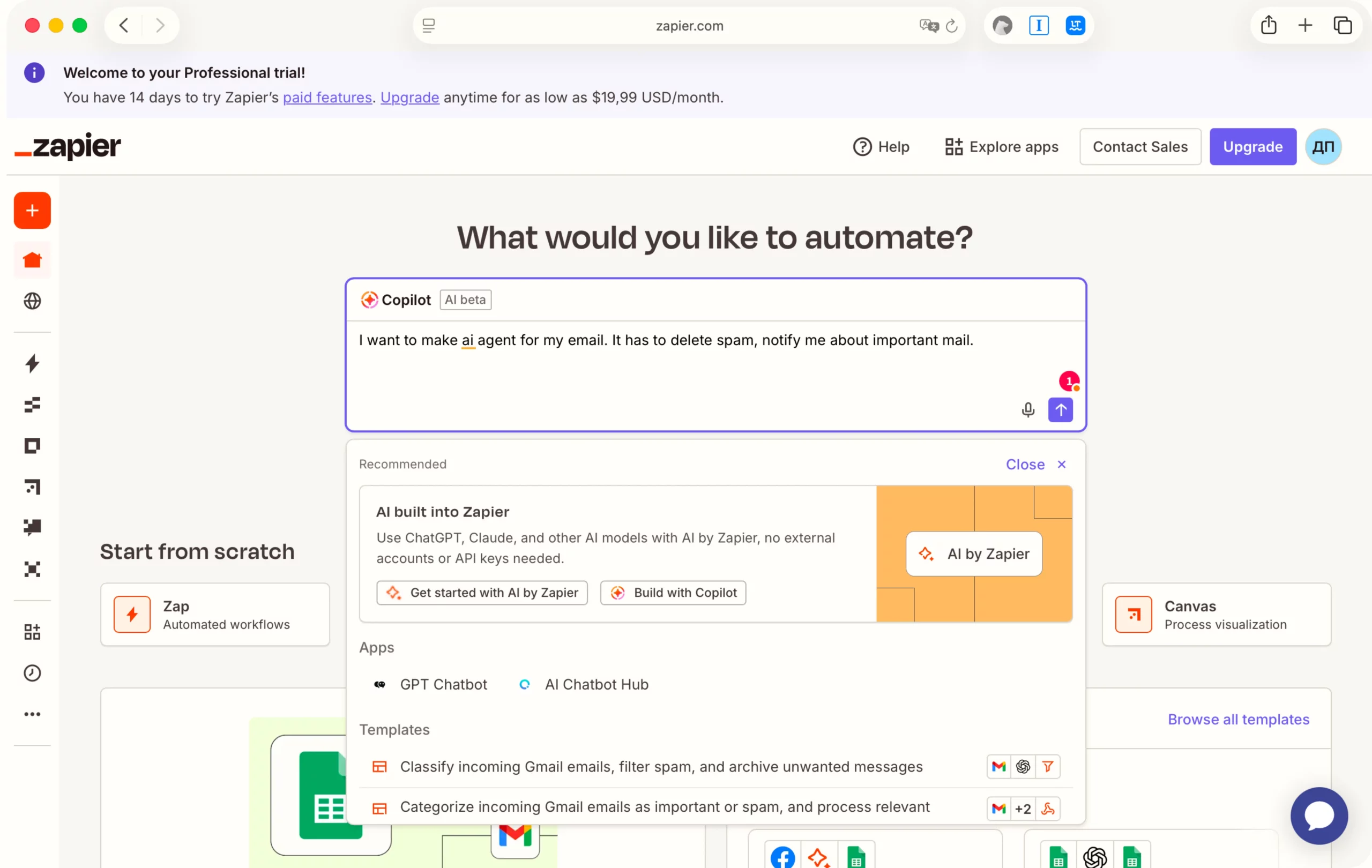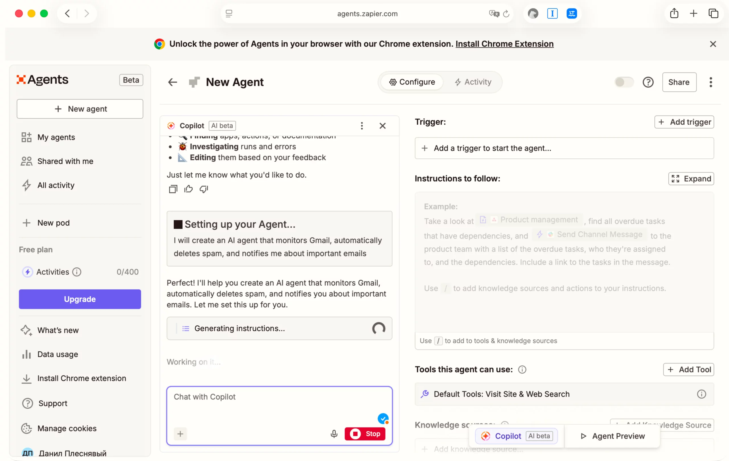 Для эксперимента я задал триггеры на платформе Zapier. Чтобы агент присылал уведомления только о тех письмах, где упоминается мое имя.