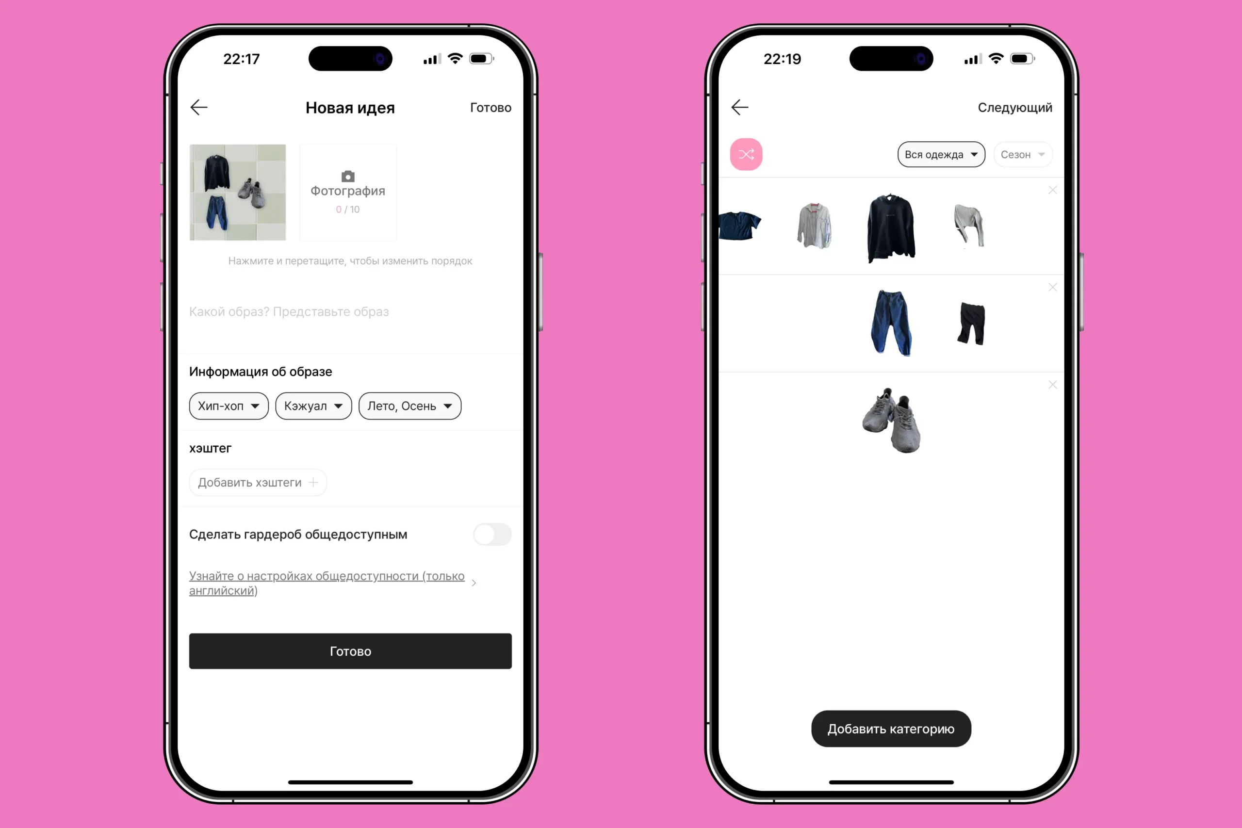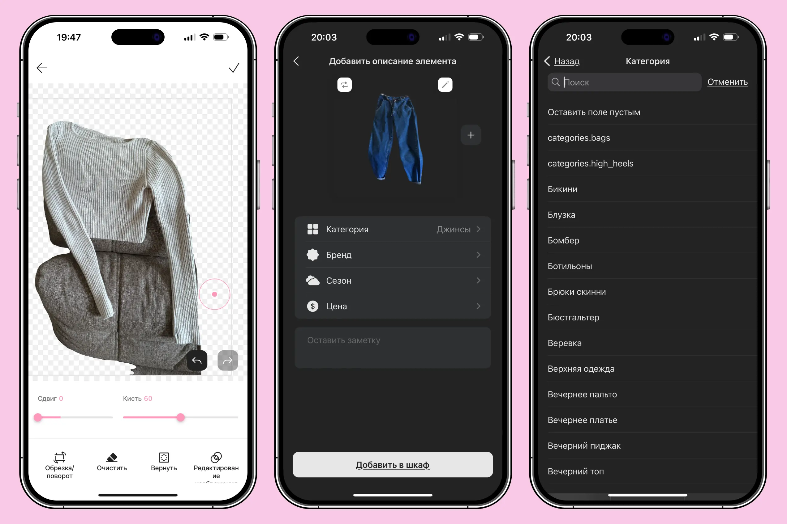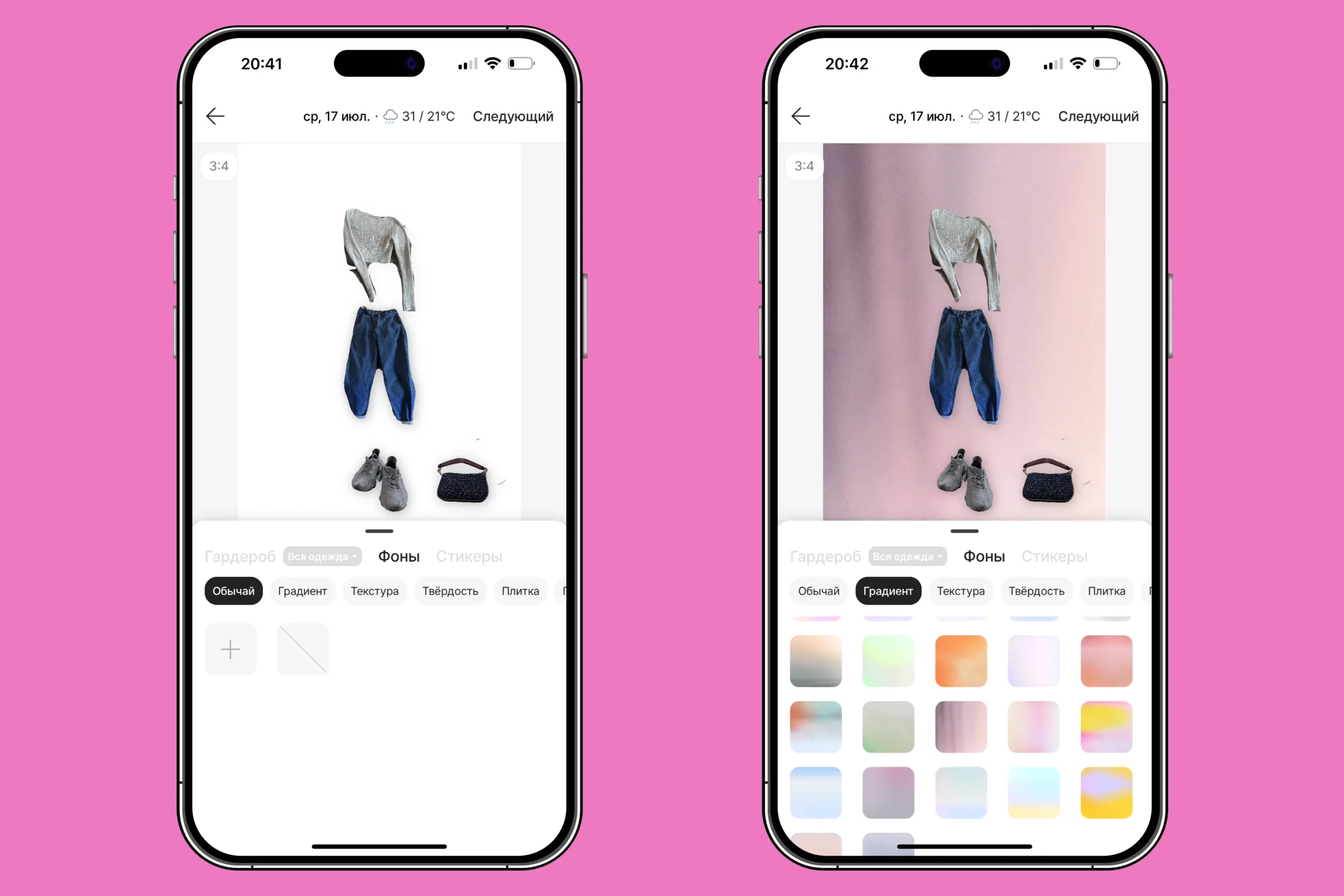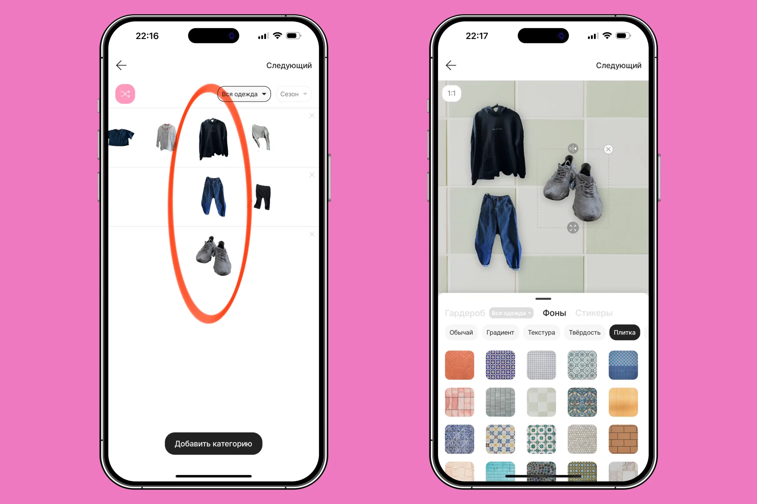Сфотографируйте все, что у вас есть: одежду, обувь, аксессуары и добавьте все в приложение. Оно автоматически удалит фон, но если где-то будут недочеты — вы сможете удалить все вручную.