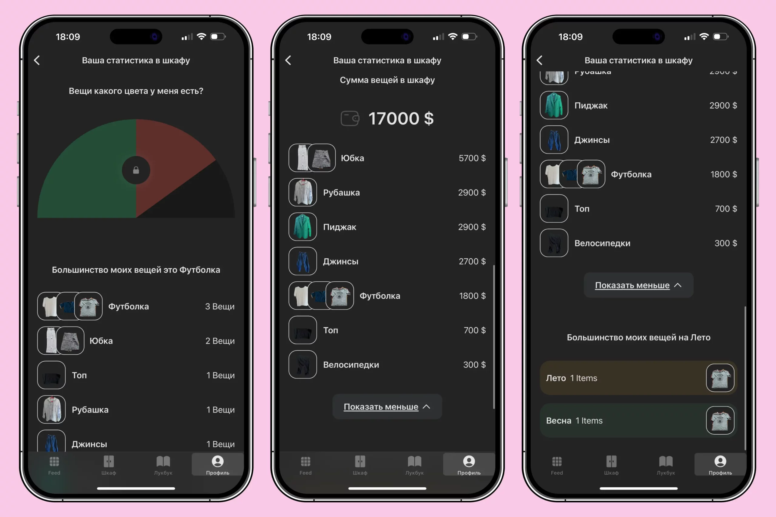 - Показывать статистику. Здесь видно, каких вещей у вас больше всего, сколько денег вы потратили на гардероб и для каких сезонов предметов одежды вам явно не хватает. Правда, почему-то сумму он показывает не в рублях, а в долларах, хотя в цене за каждую вещь я указывала рубли.
