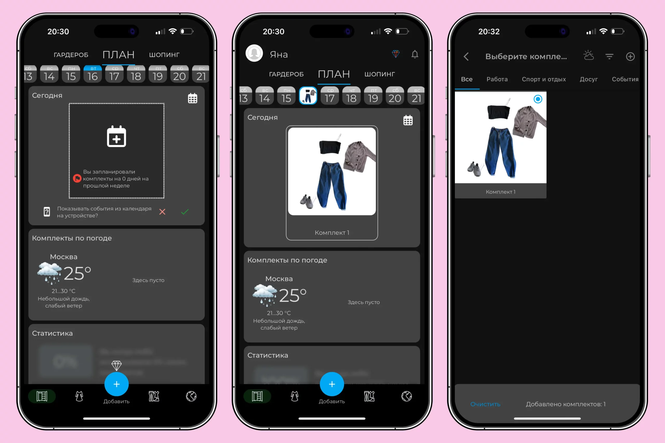 - Планировать луки на каждый день. Здесь тоже есть информация о погоде, как и в Acloset. Вы можете составить план нарядов на каждый день, выбрав образ из уже существующих комплектов.
