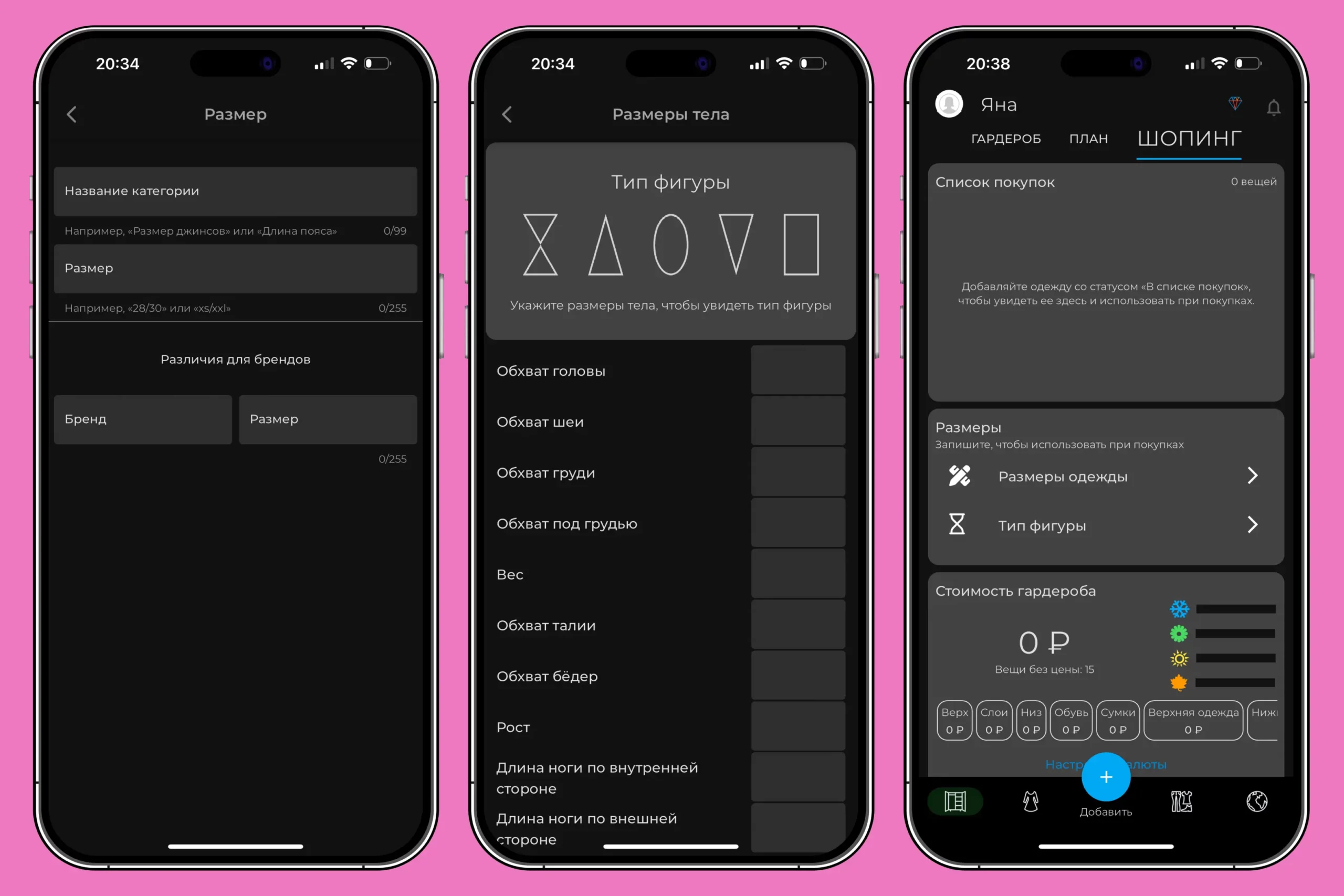 - Готовиться к шопингу. Здесь вам нужно будет ввести категорию, свои размеры и тип фигуры, чтобы в будущем ходить по магазинам, четко зная все свои параметры.