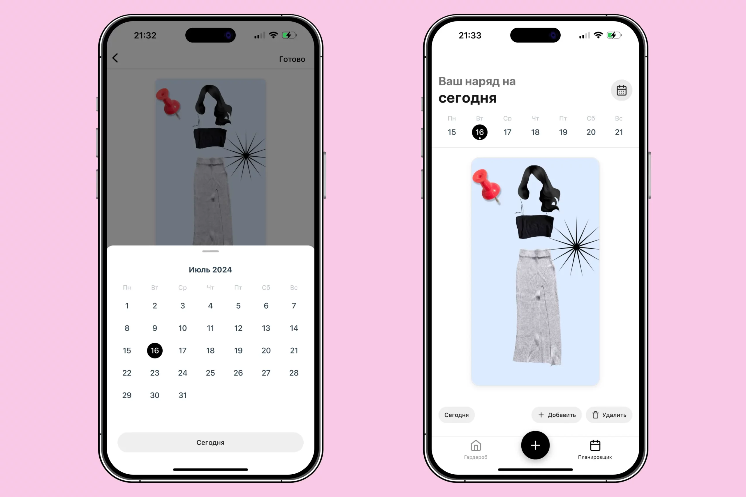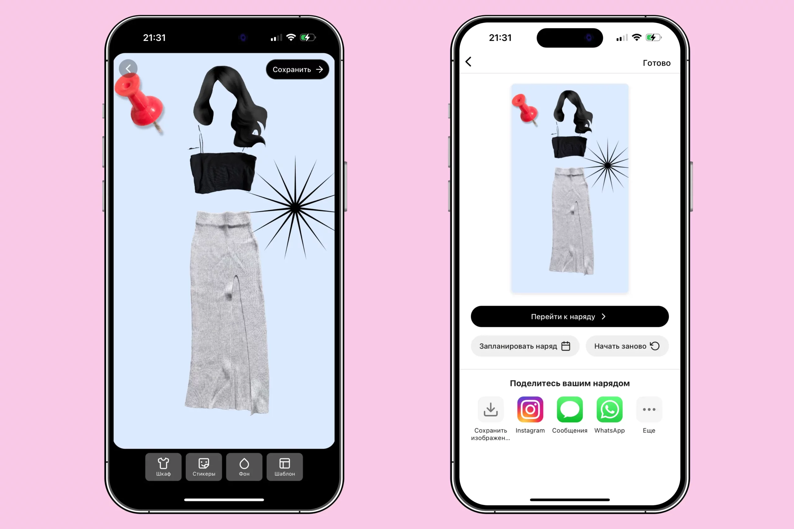 Можно оформить наряд разными стикерами и цветом фона, а после запланировать образ на какую-то конкретную дату.
