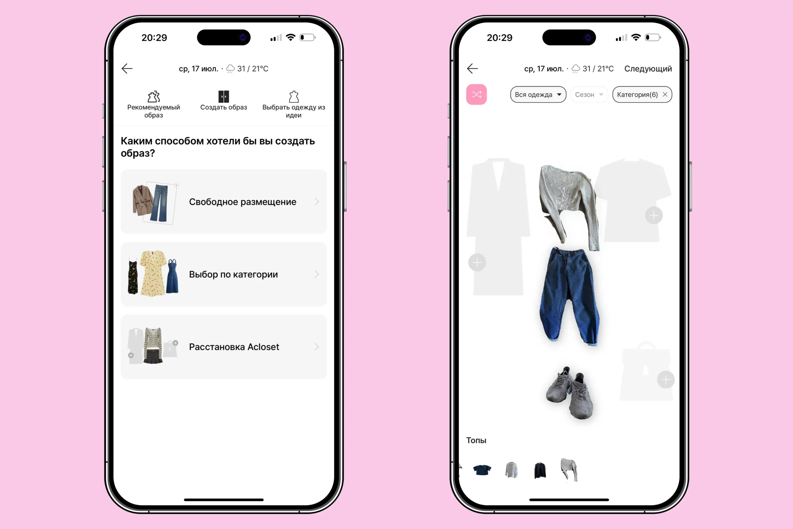 - Расстановка Acloset. ИИ генерирует образ из шести категорий: два топа, верхняя одежда, брюки, обувь и аксессуар. В том случае, если вам не понравится один из элементов образа, нажмите на него и замените вручную.