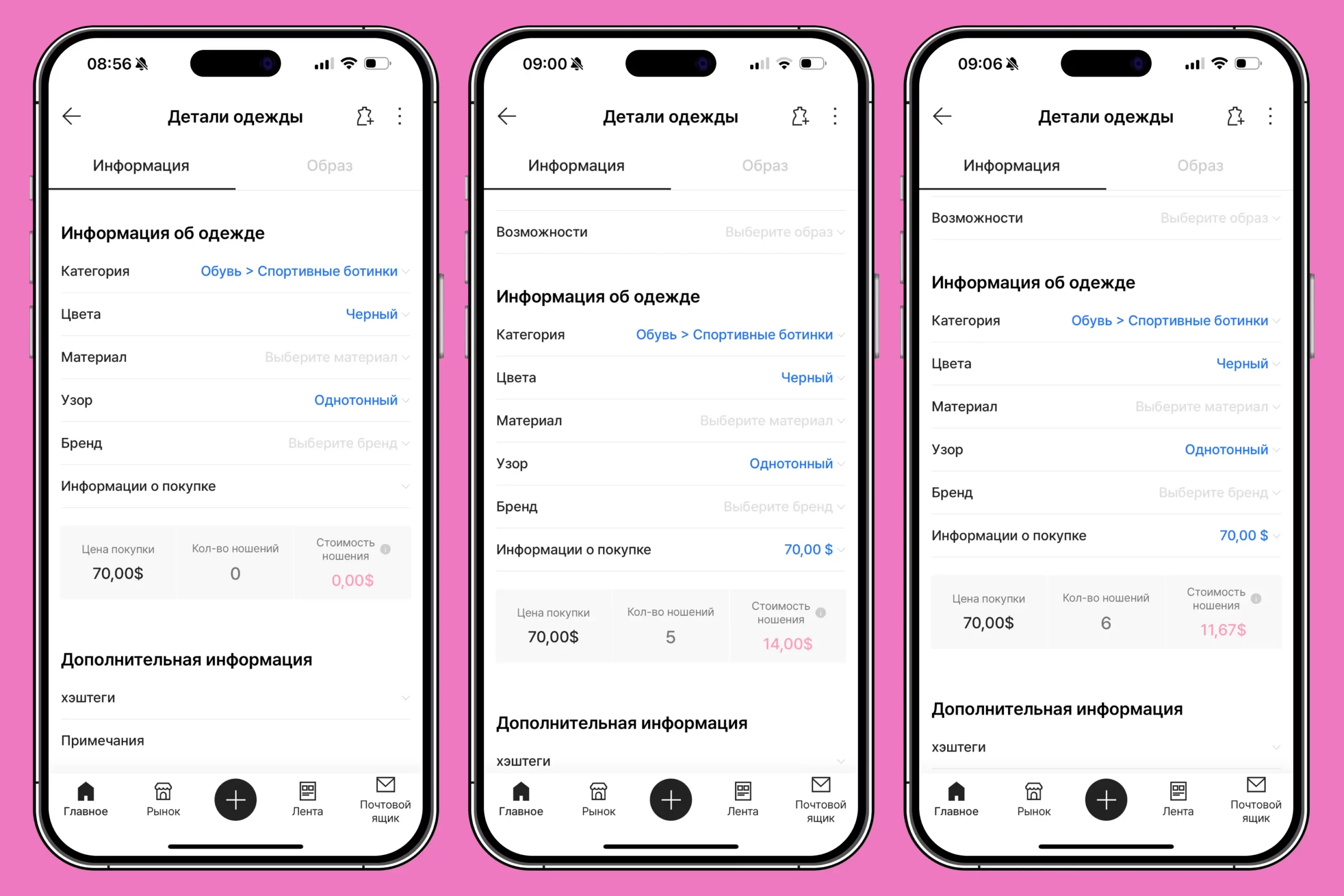 Теги для одежды во время регистрации приложение выставляет автоматически. Но если нужно подправить — вы можете сделать это самостоятельно. Здесь же добавьте стоимость предмета одежды.