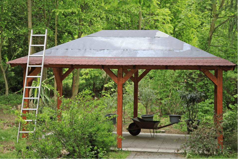 - Когда укладка крыши будет завершена, можно смело говорить о том, что наша беседка готова! Теперь по желанию ее можно покрасить, ведь краска прекрасно защищает дерево от дождей, снега и других погодных условий. Чтобы не тратить на покраску слишком много времени, можете приобрести электрический краскопульт, но помните, что использовать его лучше в безветренную погоду. Когда будете выбирать краску, покупайте стойкую к воздействию окружающей среды. Если вы не планируете красить беседку, потому что хотите сохранить цвет и рисунок дерева, используйте лак — он также защитит брус от влаги и прямых солнечных лучей.