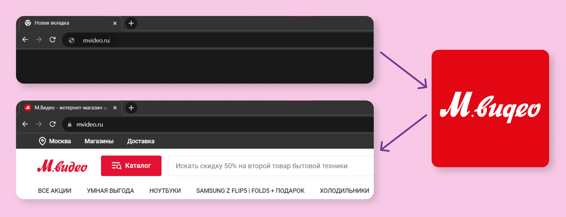 Всё описанное выше работает, потому что устройства взаимодействуют между собой с помощью IP-адресов. Но для людей запоминать последовательности октетов крайне неудобно. Поэтому создатели интернета придумали систему доменных имен (Domain Name System, DNS). Она позволяет обращаться к серверам и другим устройствам в интернете не по IP-адресу, а по имени, например, mvideo.ru.