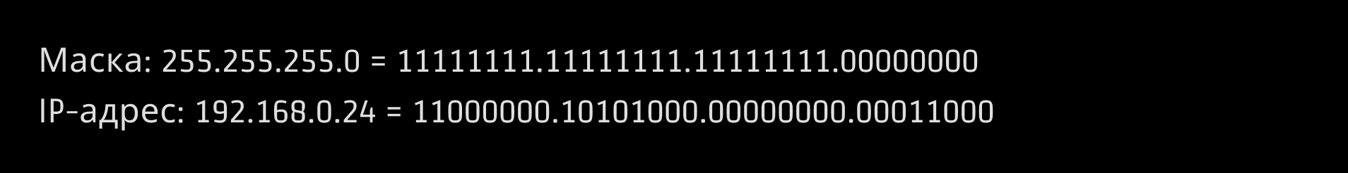 Теперь представим, что на месте единиц в маске у нас прозрачное окошко, а на месте нулей — непрозрачный пластик. Если посмотреть сквозь маску на IP-адрес, мы увидим только те двоичные разряды, которые относятся к номеру сети, и в результате получим номер сети —