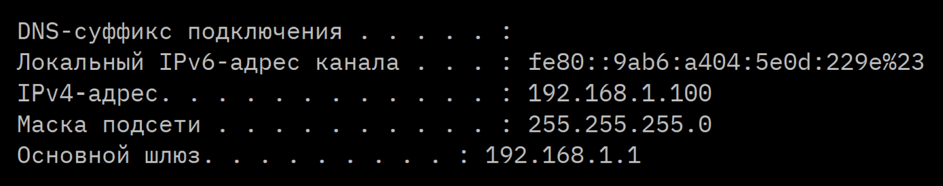 Затем ввести ipconfig и нажать Enter. Результат будет примерно таким: