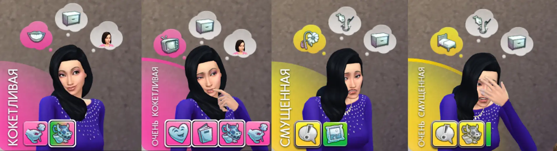 Персонажи в The Sims испытывают и ярко выражают целый спектр эмоций: от простых — радости и грусти — до сложных — ревности и депрессии.