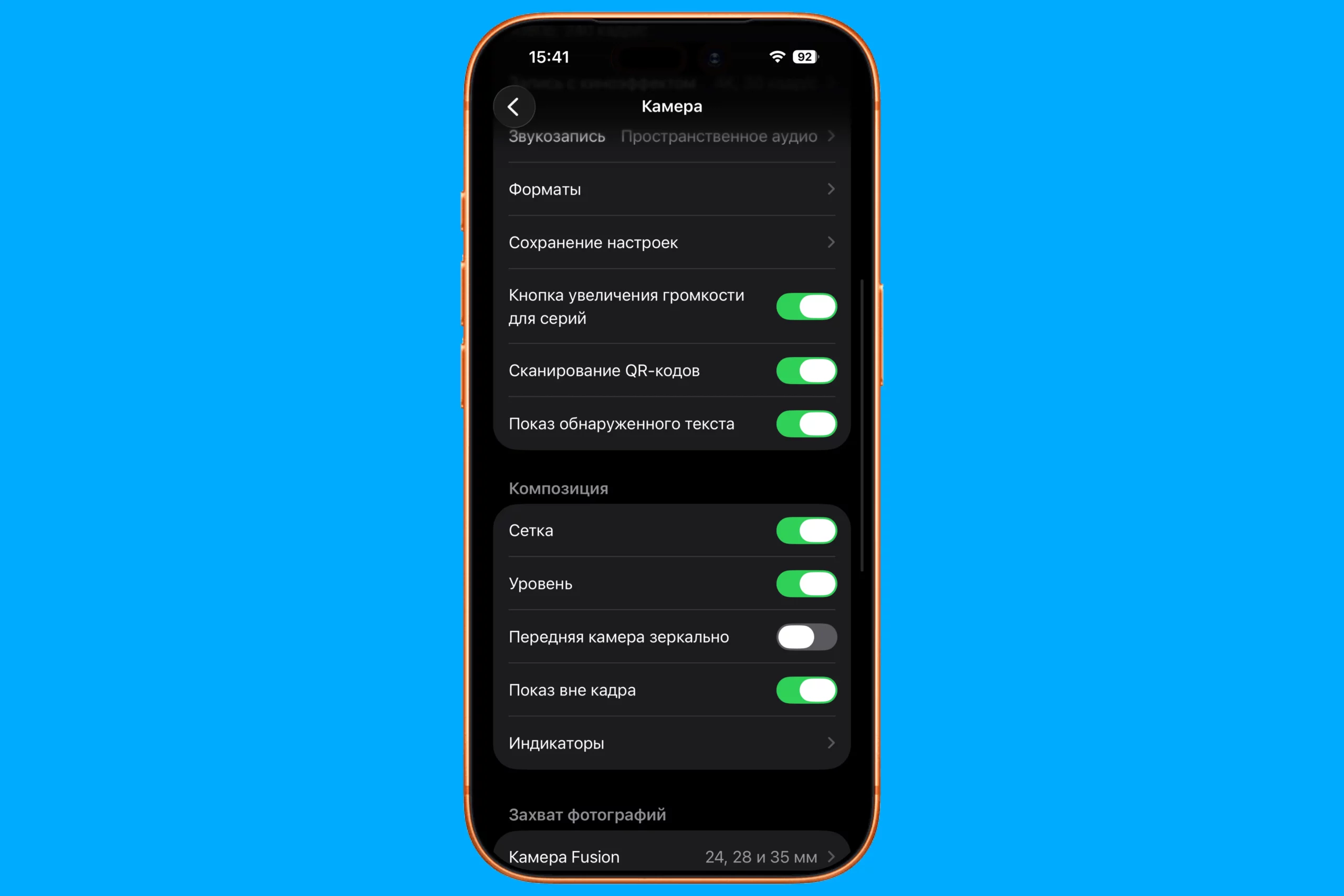 Начнем с простых, но крайне полезных помощников в фотоделе — сетки и уровня. Для этого открываем настройки айфона, переходим во вкладку «Камера» и в разделе «Композиция» переводим ползунки «Сетка» и «Уровень» в правое положение. Для чего мы это сделали?