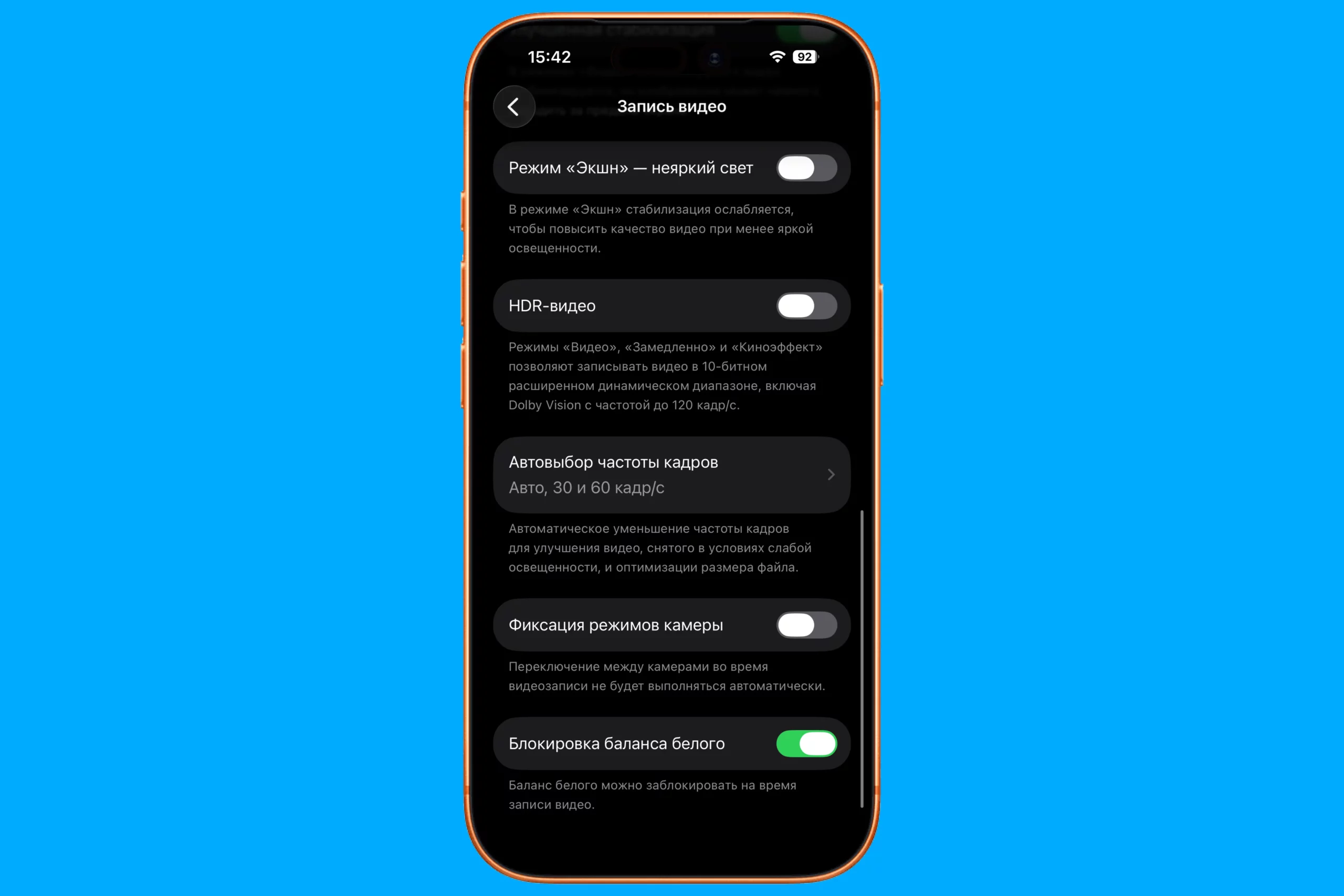 Кстати, второй вариант настройки очень удобно поставить на кнопку-селектор Camera Control, которая появилась в 16-м поколении айфонов. Как это работает? Для селектора есть несколько вариантов работы: зумирование, выбор фильтра, настройка экспозиции и прочее. Нам как раз нужна экспозиция, выбираем ее, и теперь, если мы проведем по поверхности в момент съемки, то картинка станет либо темнее, либо светлее — и не надо в меню лезть.