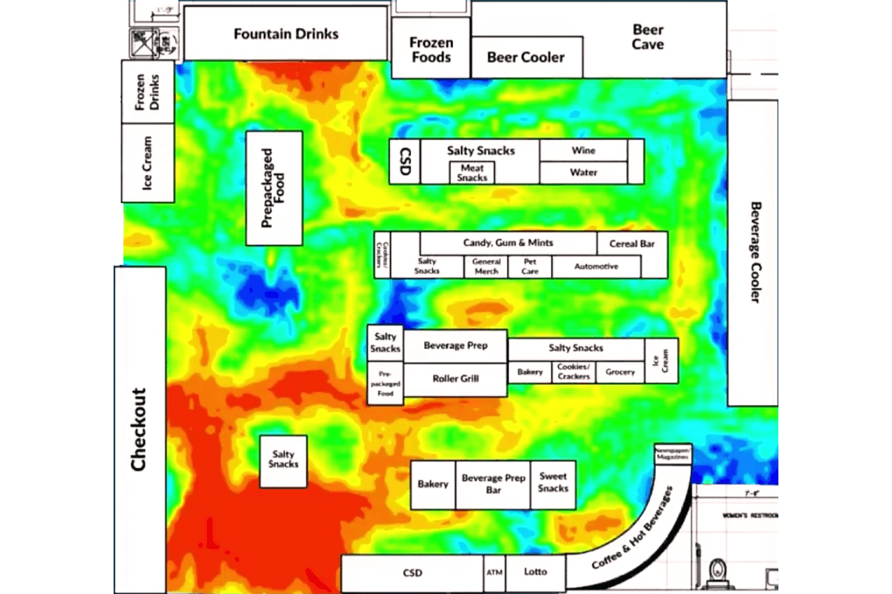 Так выглядит тепловая карта перемещений покупателей по магазину, которую разработала компания VideoMining. С ее помощью можно анализировать физический путь покупателя и грамотно распланировать торговый зал. Фото: VideoMining / Twitter