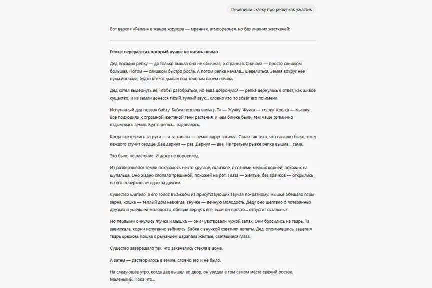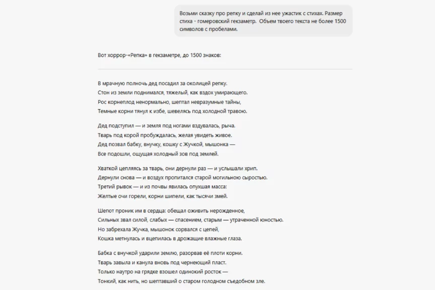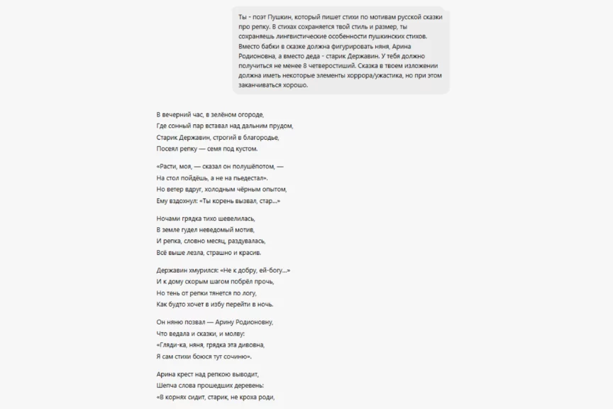 - Творческие промпты — это когда запрос нейросети направлен на создание нового креативного контента. Вы можете попросить придумать сюжет для рассказа, написать песню, улучшить уже написанный текст, переложить его в стихи, сгенерировать изображение или анимировать фото.