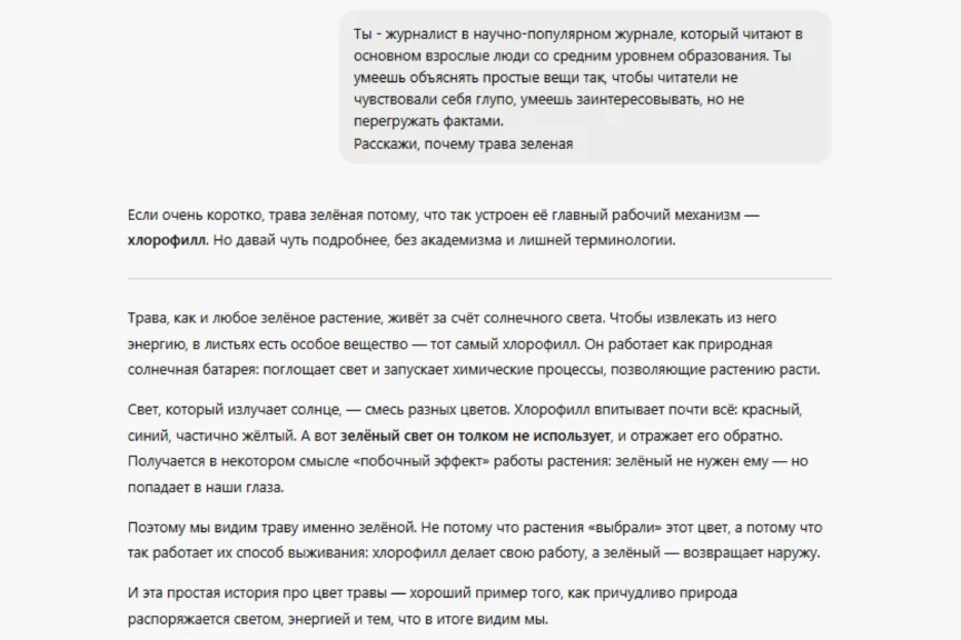 Например, если вы просите чат-бот объяснить тему квантовой суперпозиции, результат может быть слишком сложным или, наоборот, слишком упрощенным. Но если добавить: «для взрослой аудитории без технического образования», — модель выберет совсем другой уровень подачи.