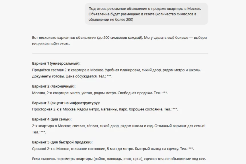 Хорошая инструкция не бывает расплывчатой. Она четкая, поэтапная и задает конкретные действия. Например, если вы хотите получить структурированный текст, не ограничивайтесь фразой: «Сделай лучше», — модели нужно прямое указание: «разбей ответ на пункты», «сформулируй вывод», «оформи рекомендации». Такой подход особенно важен, когда речь идет о задачах, связанных с анализом данных: подготовка резюме, генерация изображений для презентации — в общем, там, где картинка или текст должны иметь четкую структуру или формат.