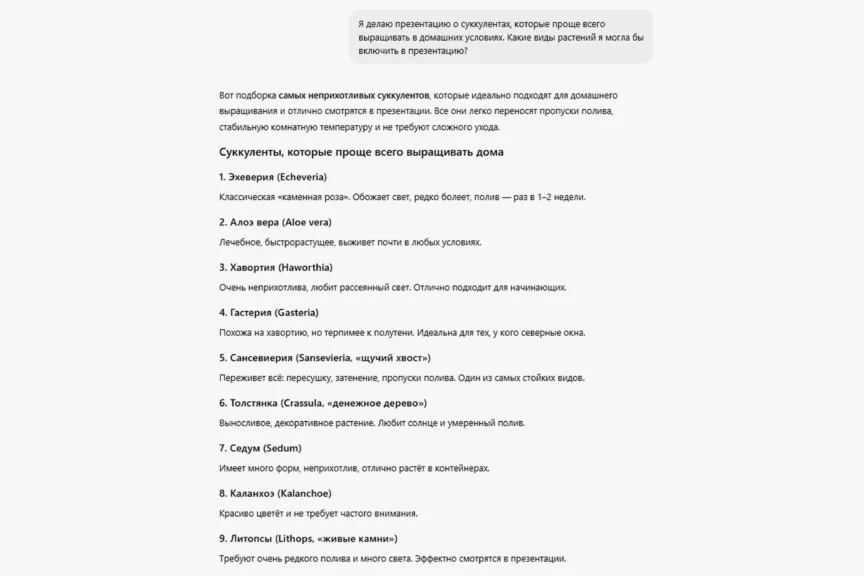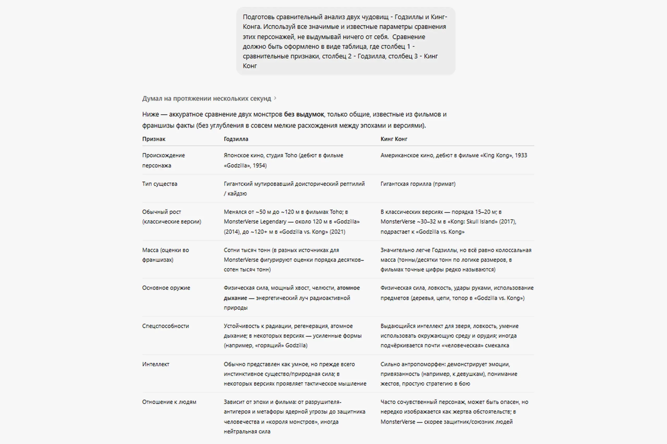 Модель легче справится с задачей, если сразу написать: «Сравни по пунктам — плюсы, минусы, вывод». То же работает для инструкций, коротких пояснений, подборок и даже небольшой аналитики.