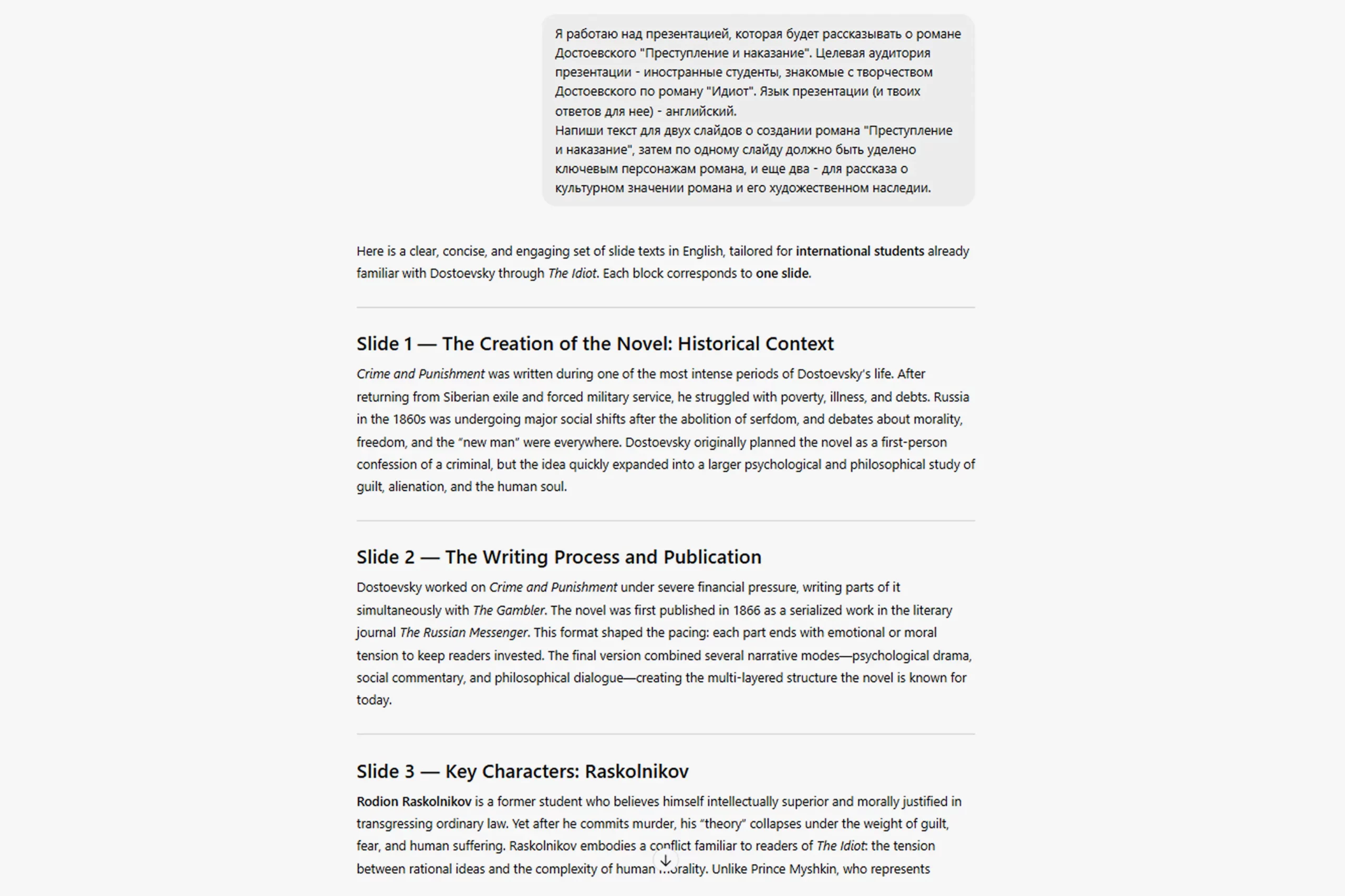 Я рекомендую больших «слонов» делить на части и каждую задачу решать отдельно и только потом сводить все в единый документ. С помощью нейросетей, конечно.