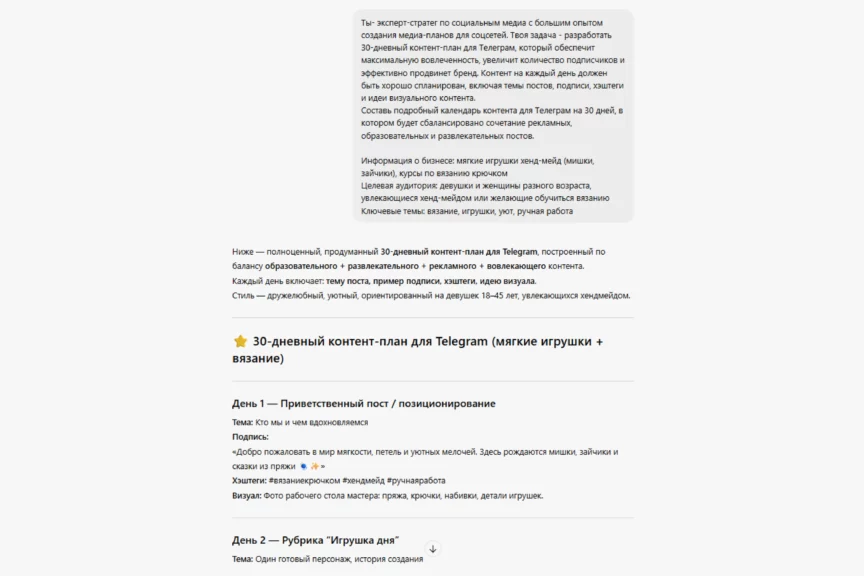 Формат особенно важен в сложных запросах, где результат должен быть одинаковым при каждом шаге: например, серия карточек для соцсетей, набор тезисов для презентации или список вопросов для интервью. Модели проще следовать структуре, если вы задаете ее заранее, а не пытаетесь выправить форму уже после получения ответа.