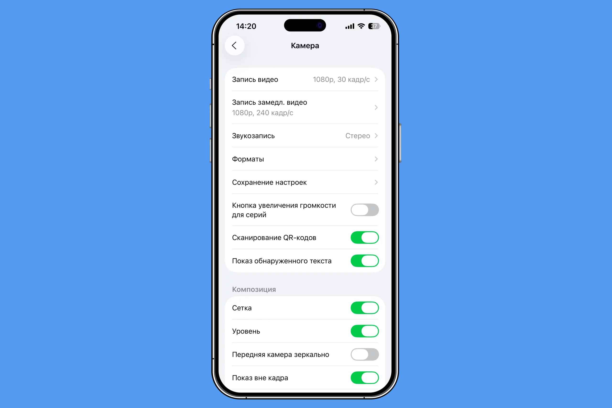 В настройках камеры вы можете выбрать формат съемки, частоту кадров в видео, композицию и фокус. Чтобы сделать это, выполните следующие действия: