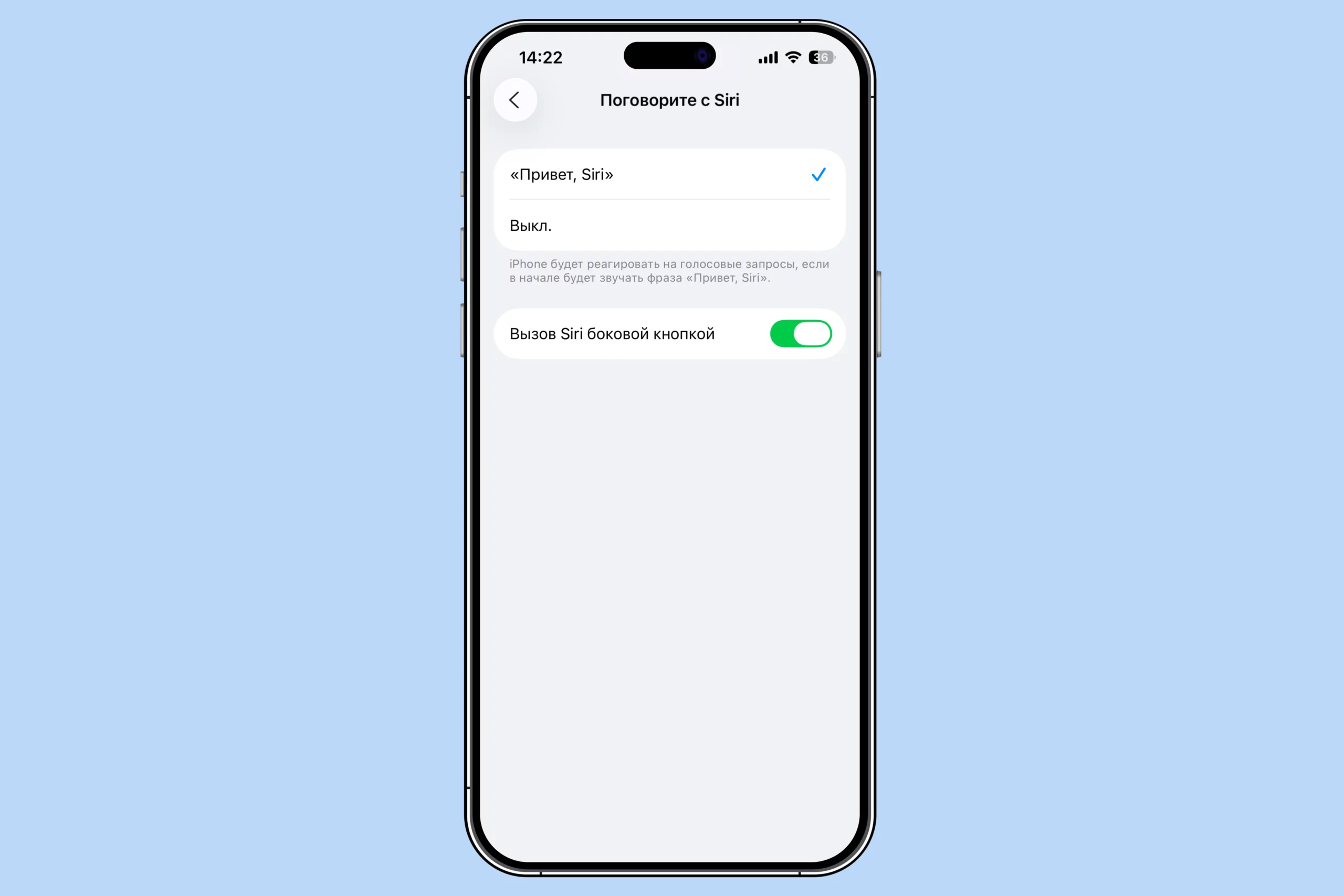 - Выберите опцию «Привет, Siri» и активируйте вызов Siri боковой кнопкой.
