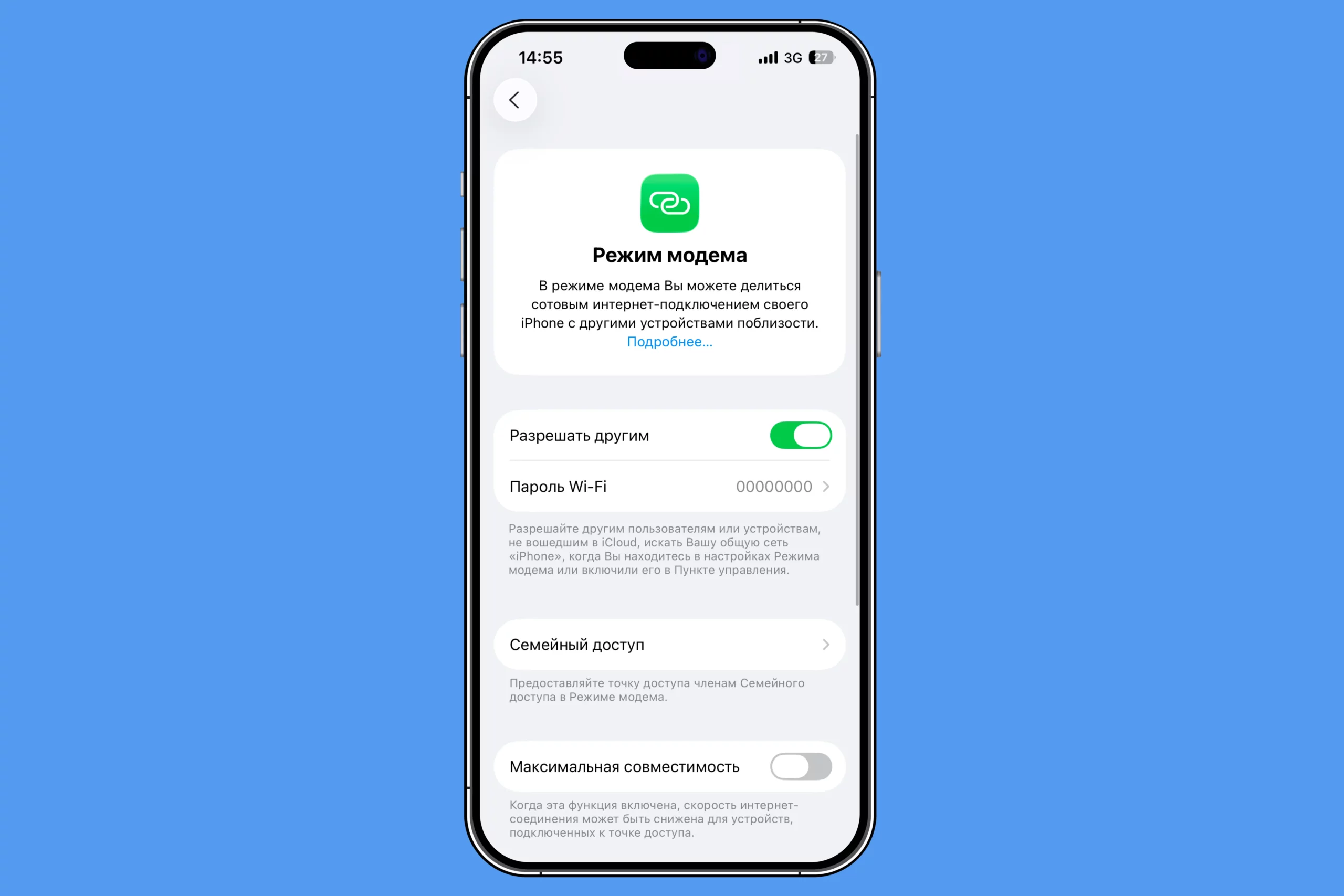 Чтобы подключиться к айфону в режиме модема, на другом устройстве выберите имя вашего смартфона и подключитесь к нему по Wi-Fi или Bluetooth. Компьютер можно подключить по USB-кабелю.
