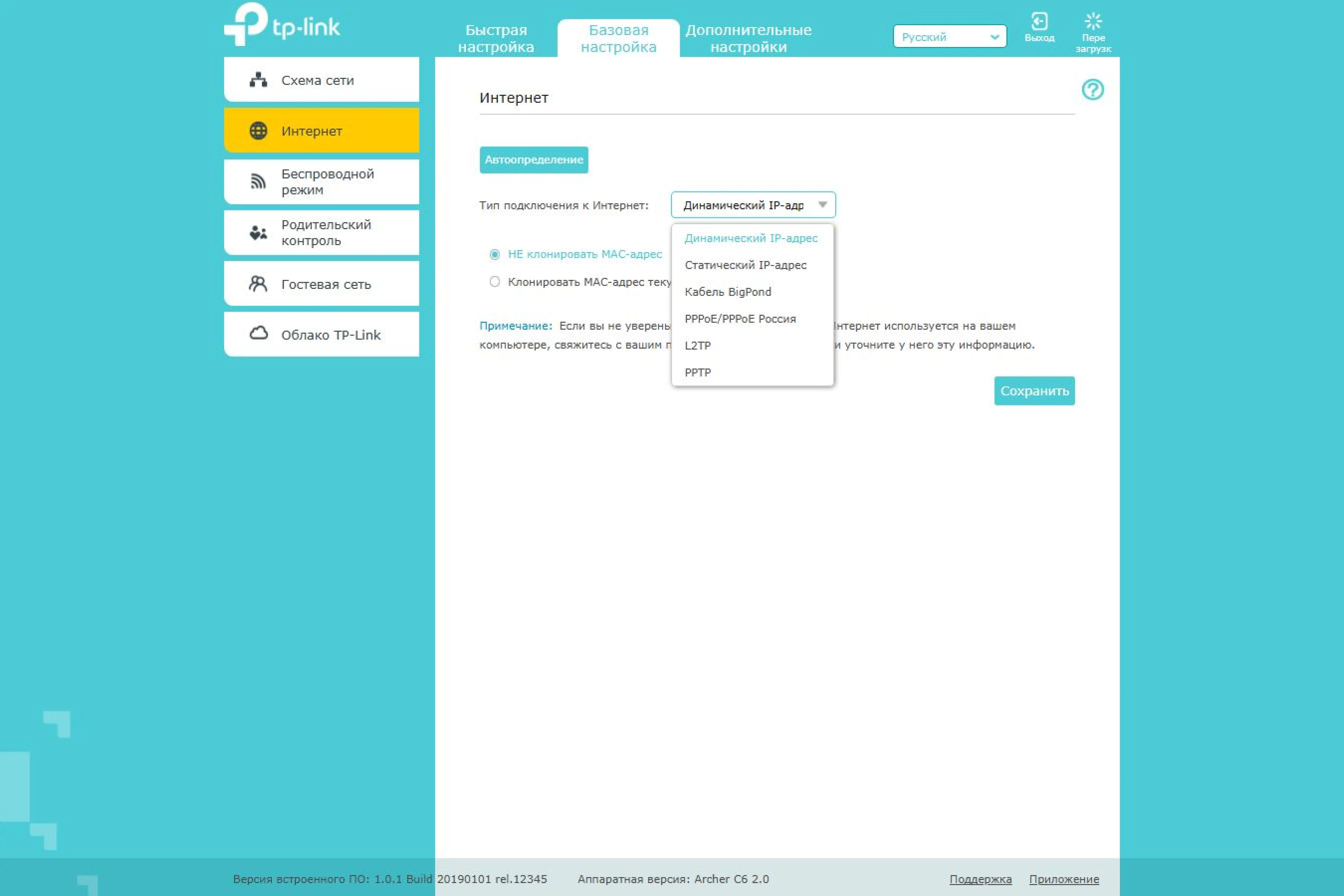 - В списке типов подключения выберите нужный вариант: Автоматический (Auto, Динамический IP или DHCP, если провайдер не дает данные для входа), PPPoE (если провайдер дает логин и пароль) или Статический IP (Static IP, если вам выдали IP, маску подсети, шлюз и DNS-адреса).