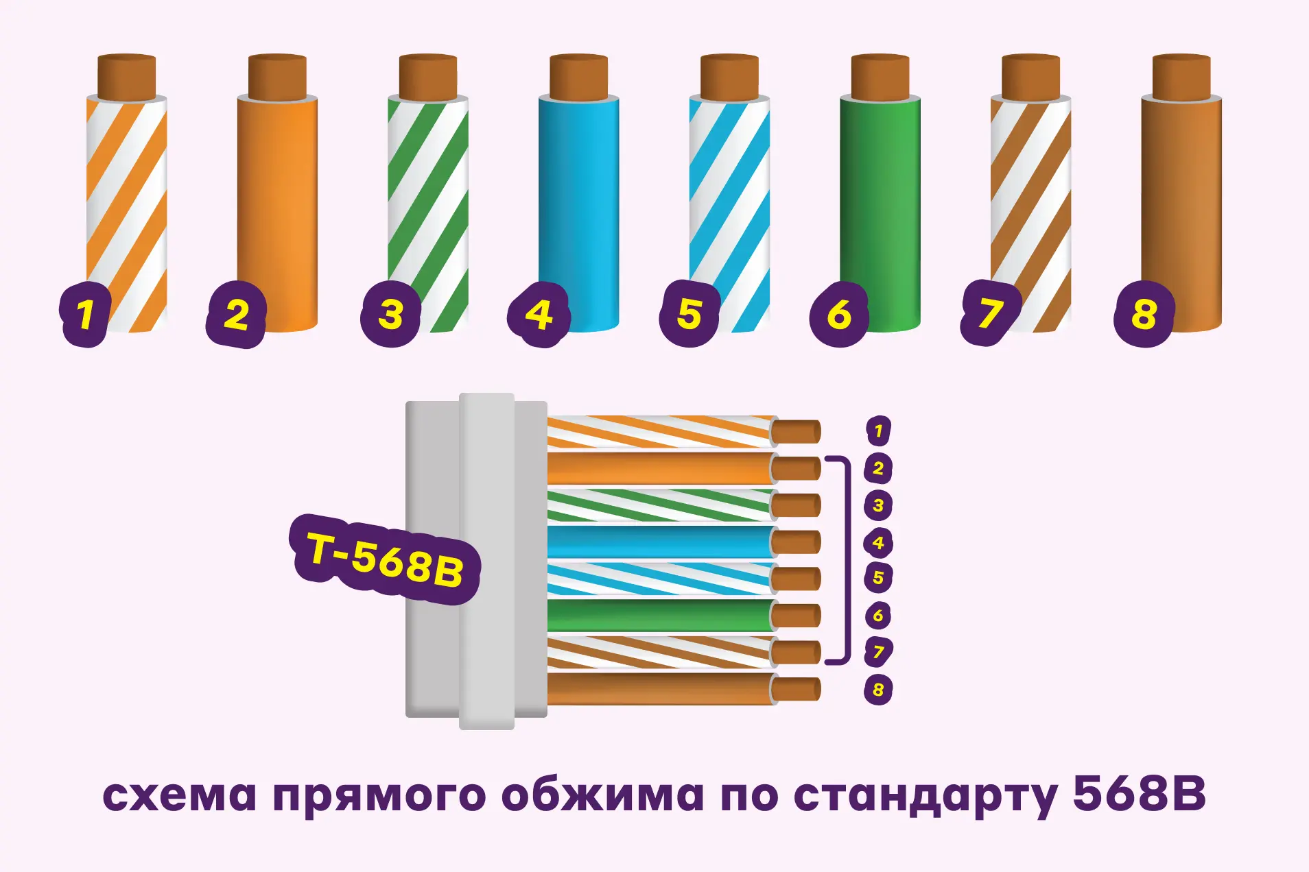 Прямой обжим по стандарту 568B требует такого порядка расположения проводов, как изображено на схеме. Коннектор должен быть повернут к вам медными контактами.