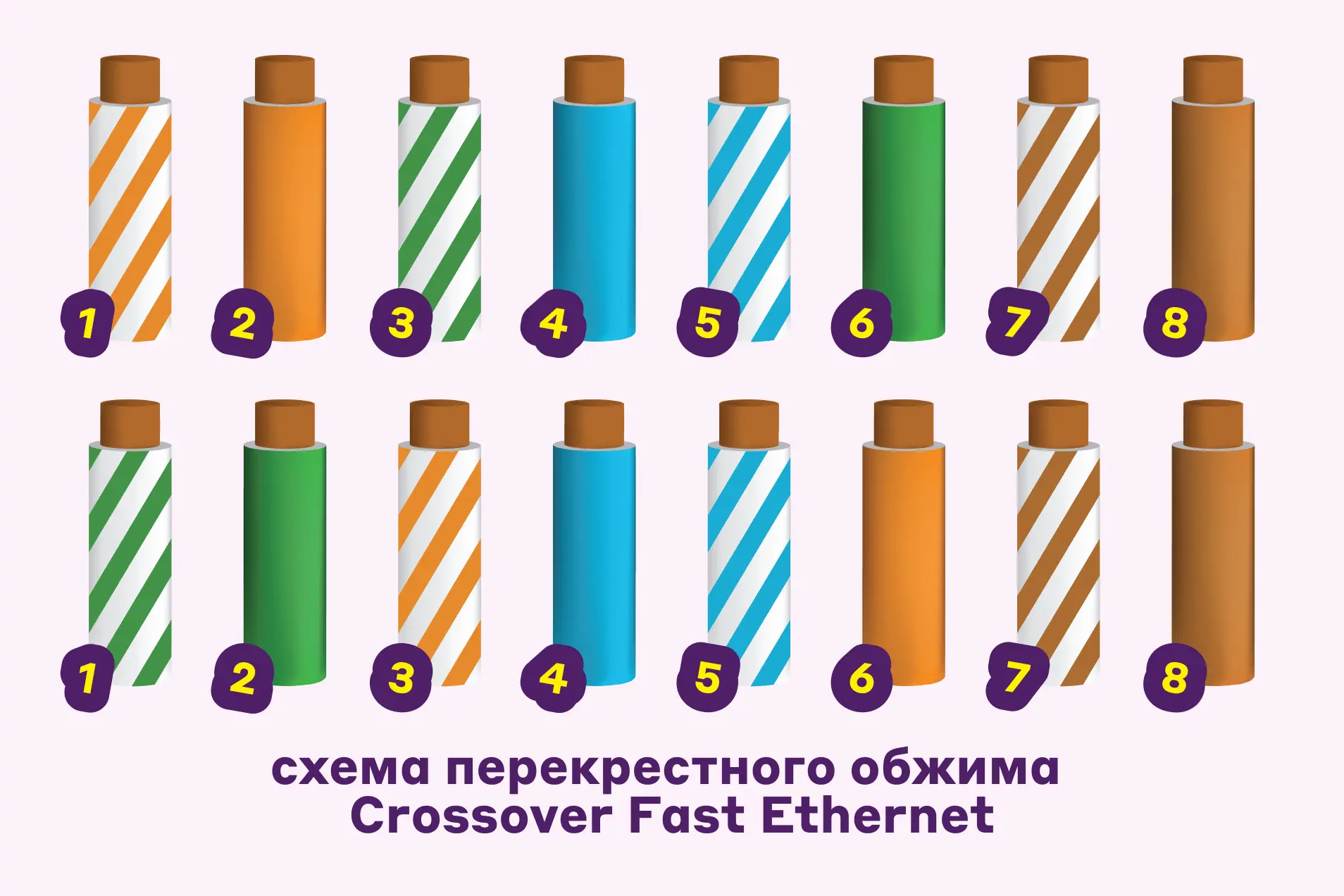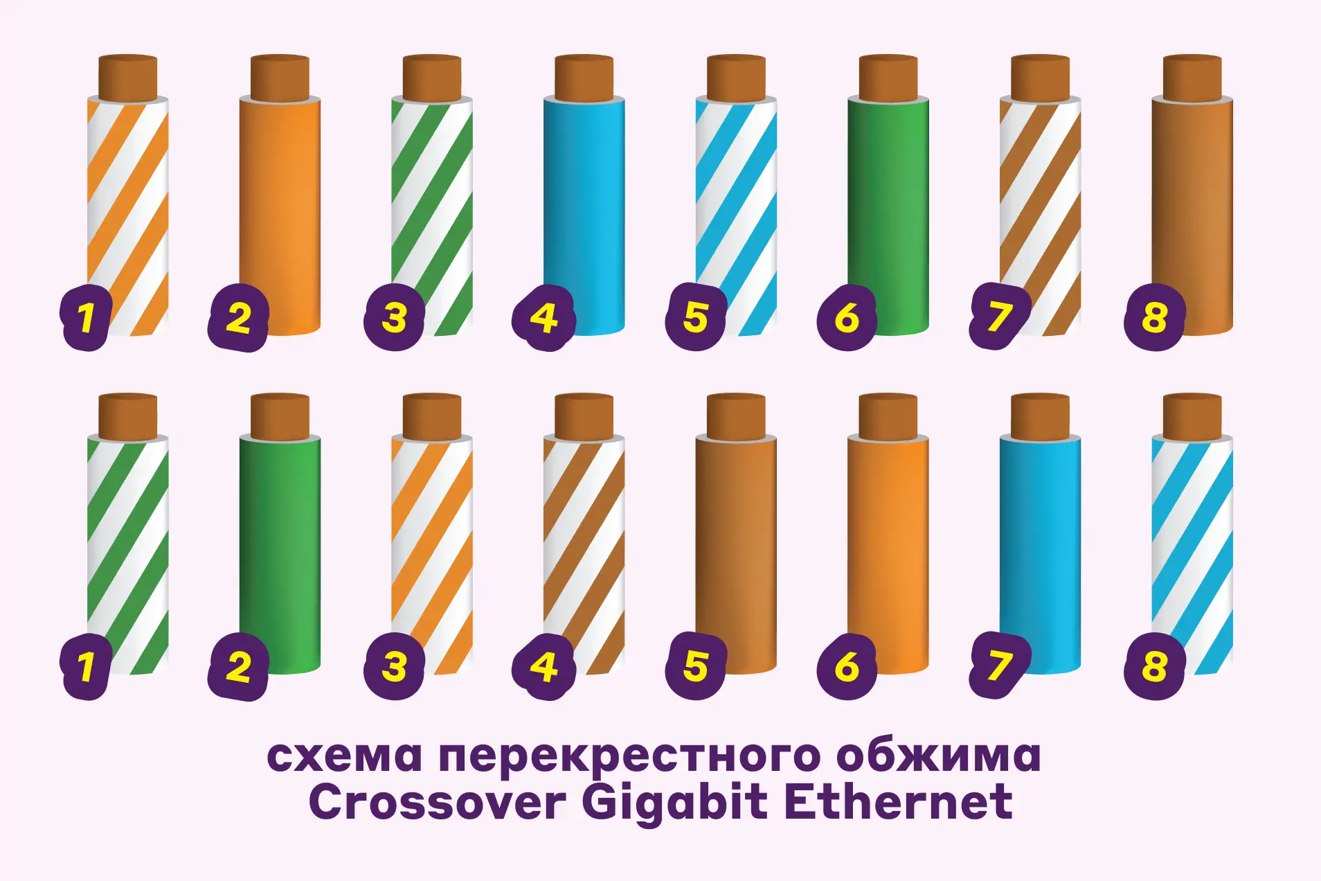 Используется для соединения однотипных устройств, например компьютера с компьютером или роутера — с роутером. Современные устройства, как правило, могут без труда работать и с прямым обжимом, но устаревшее оборудование (старые сетевые карты в ПК, маршрутизаторы из начала нулевых) требует кросс-коннект.