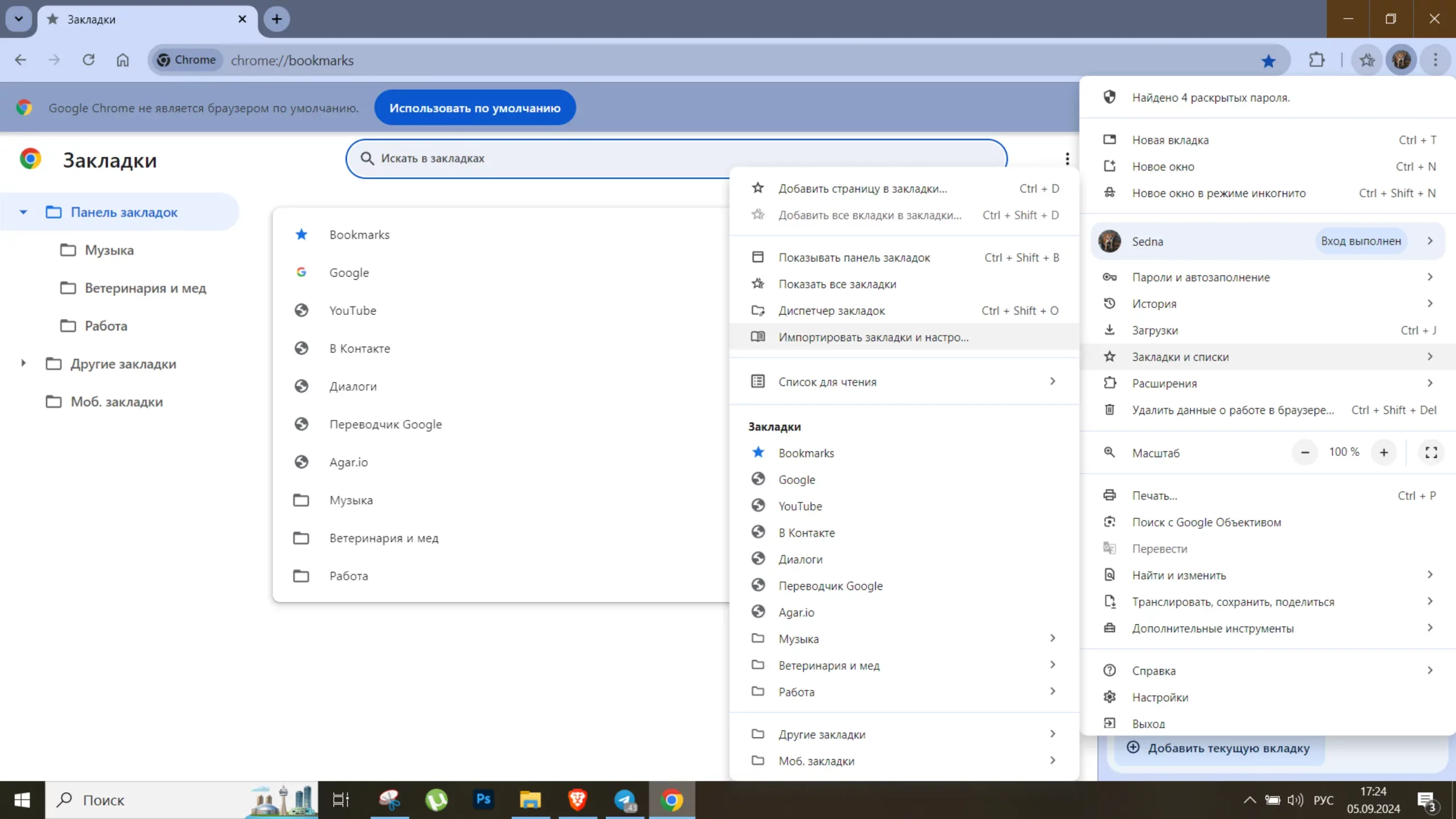 - Экспортируйте или сохраните закладки с паролями. Нажмите на три точки в правом верхнем углу, перейдите в «Закладки и списки» → «Импортировать закладки и настройки».
