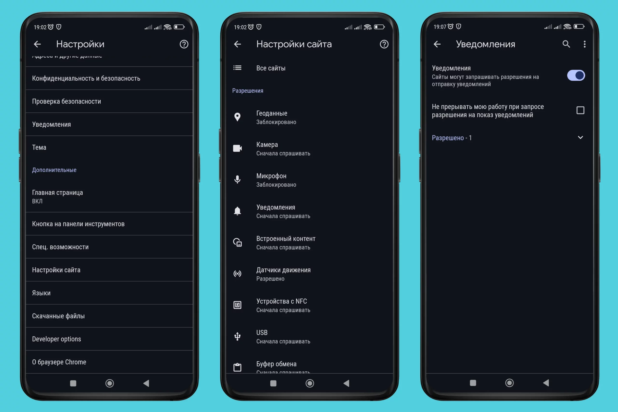Если вы пользуетесь Chrome, то для того, чтобы отозвать все разрешения, войдите в параметры через кнопку в правом верхнем углу экрана и перейдите по пути «Настройки сайта» — «Уведомления» и удалите из списка лишние ресурсы. Вдобавок можно заблокировать появление диалогового окна с запросом на отправку сообщений. Для этого деактивируйте эту возможность на этой же странице. Второй пункт меню позволяет включить тихий режим: сайты будут запрашивать разрешение, но всплывающее окно не будет разворачиваться на половину экрана.
