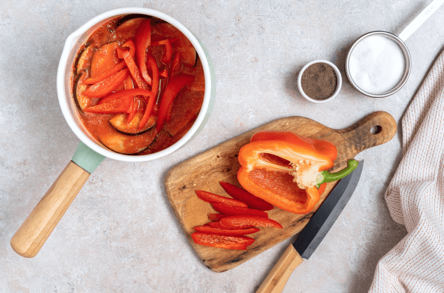 Шаг 3. У сладких перцев уберите плодоножки, семена и перегородки, а мякоть нарежьте соломкой. Добавьте в кастрюлю и готовьте с остальными овощами 7 минут.