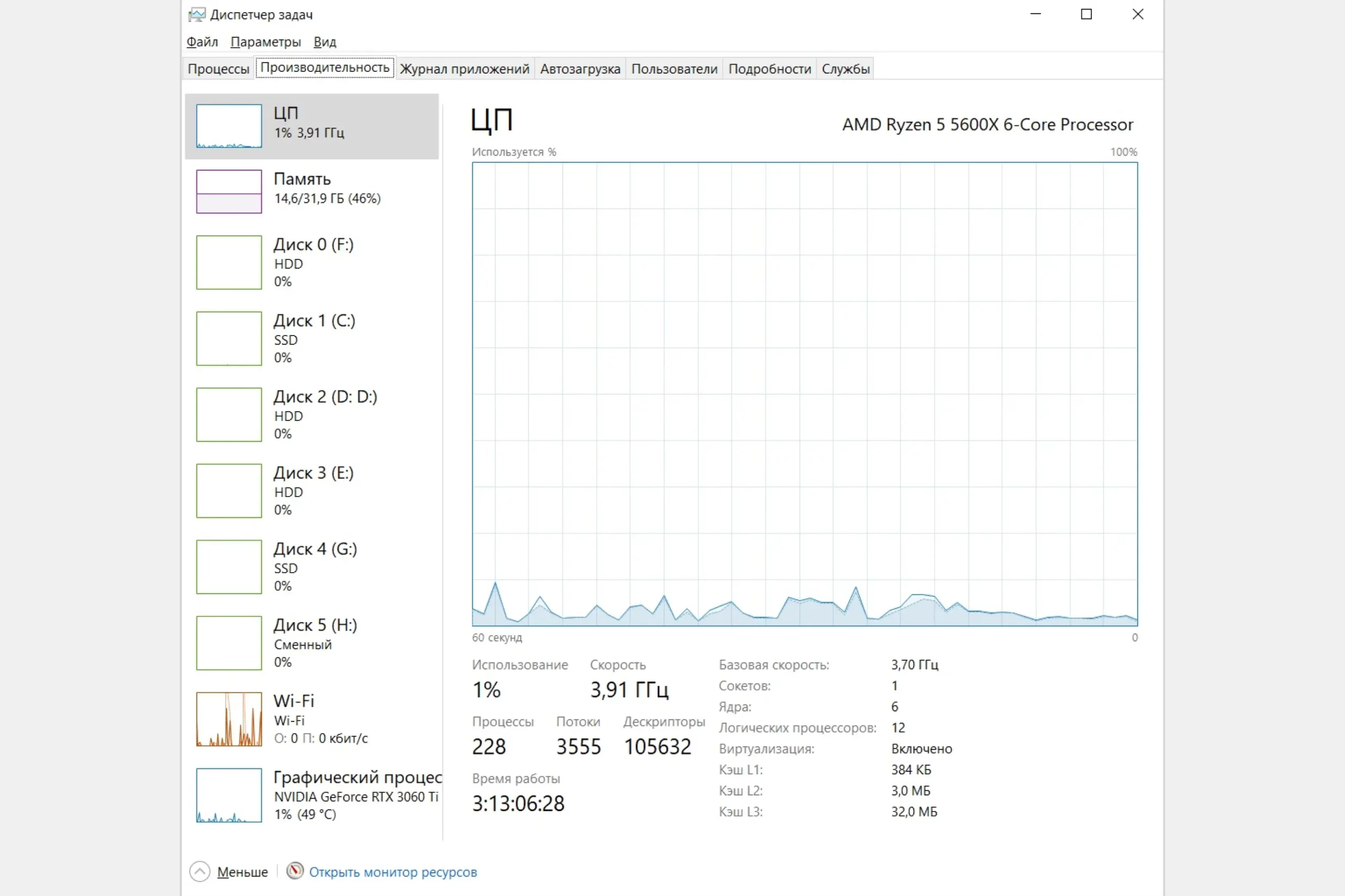 3. Переключитесь на вкладку «Производительность». Это основной раздел для мониторинга загруженности железа.