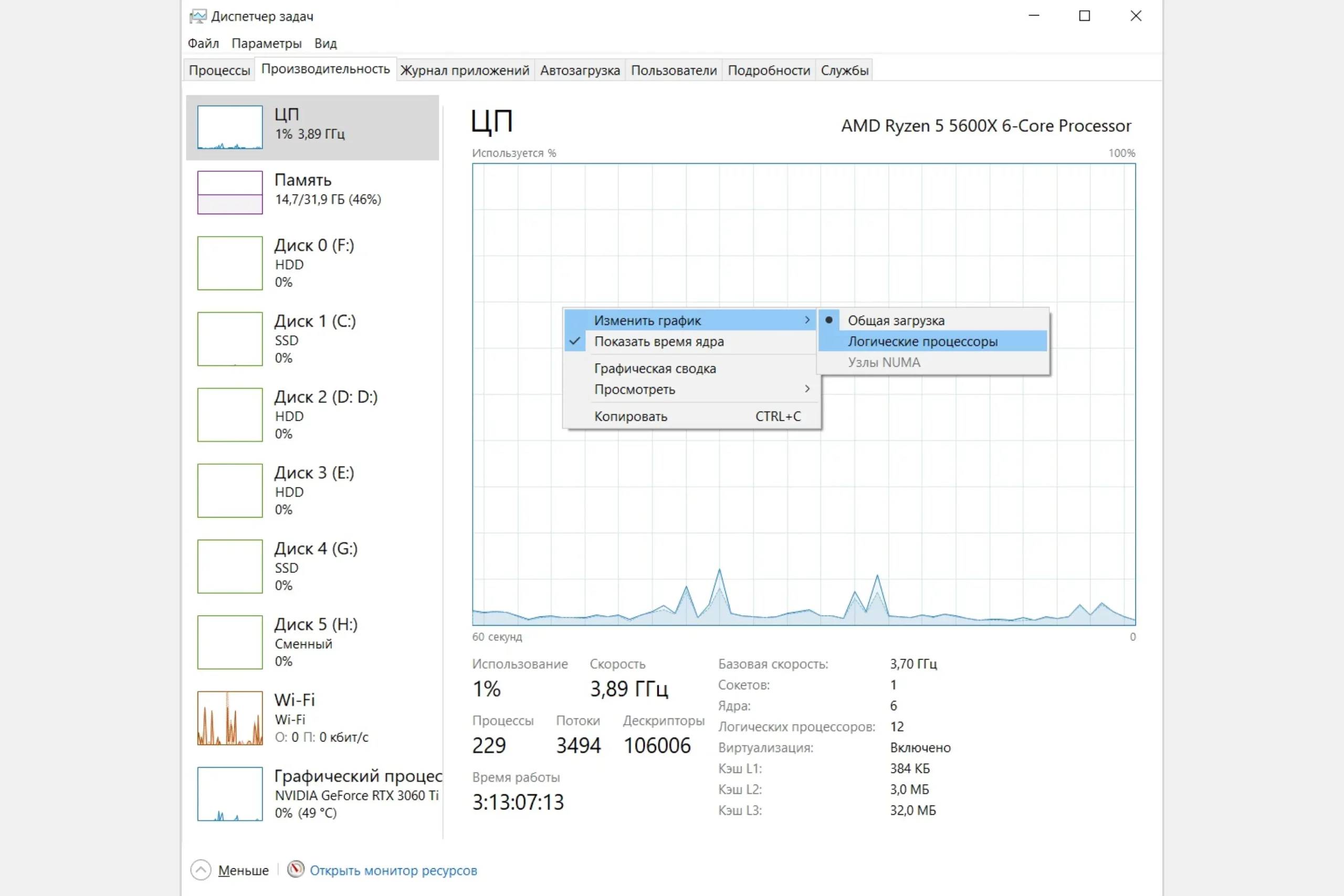 1. Процессор (CPU). График показывает общую загруженность процессора. Щелкните правой кнопкой мыши на графике CPU и выберите «Изменить график» → «Логические процессоры». Если даже одно ядро загружено на 100%, это может ограничивать работу в играх. А если загружены все, то система будет зависать полностью. На перегрев или проблемы с питанием может указывать заниженная частота процессора под нагрузкой.