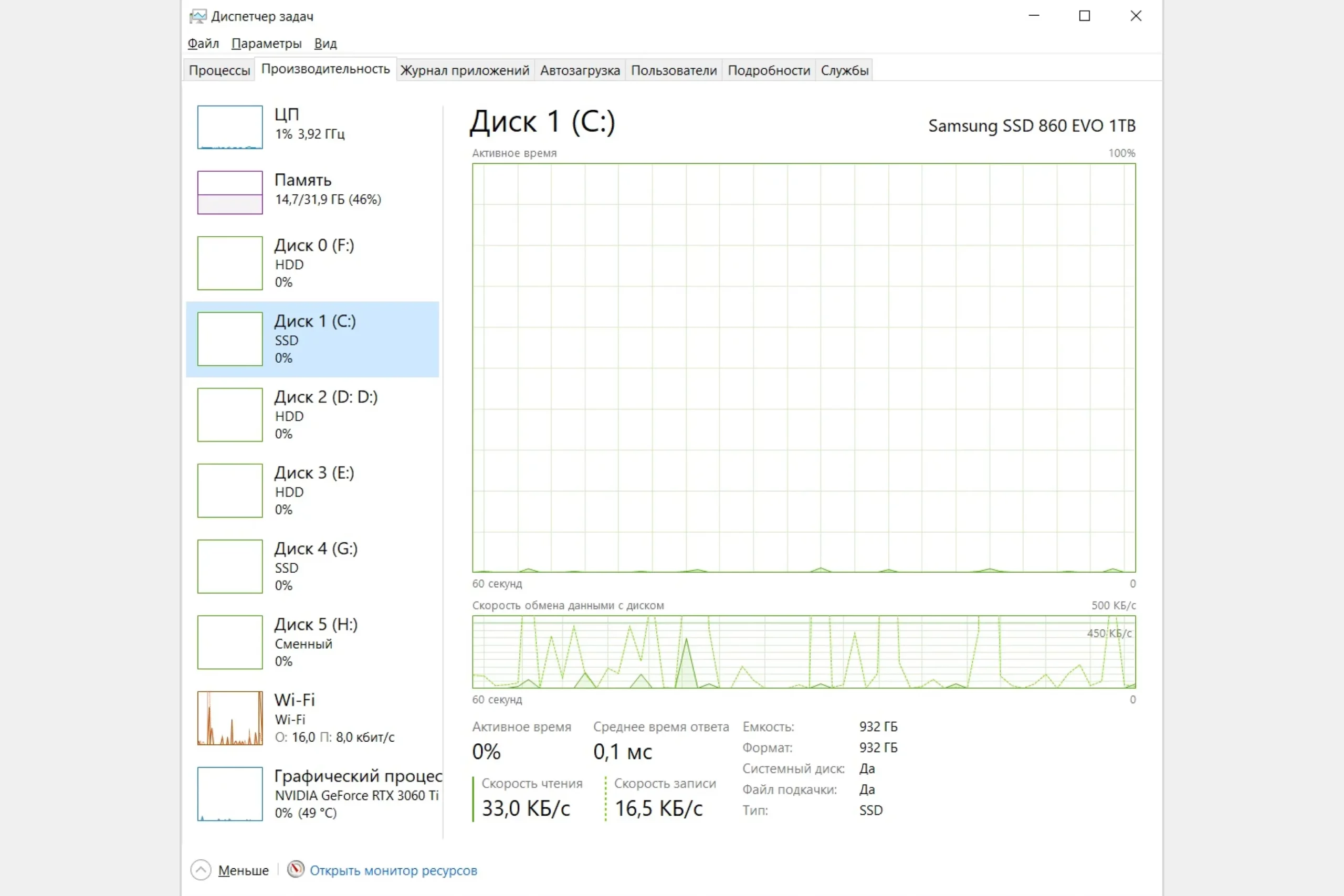 3. Диски (HDD/SSD и другие). Если даже один диск постоянно загружен на 100% и «время ответа» растет, это может указывать на то, что компонент работает на пределе своих возможностей и замедляет всю систему. В нашем случае это могут быть старые HDD, дешевые SSD или SD-карты. Также на диске всегда должно быть минимум 15% свободного пространства.