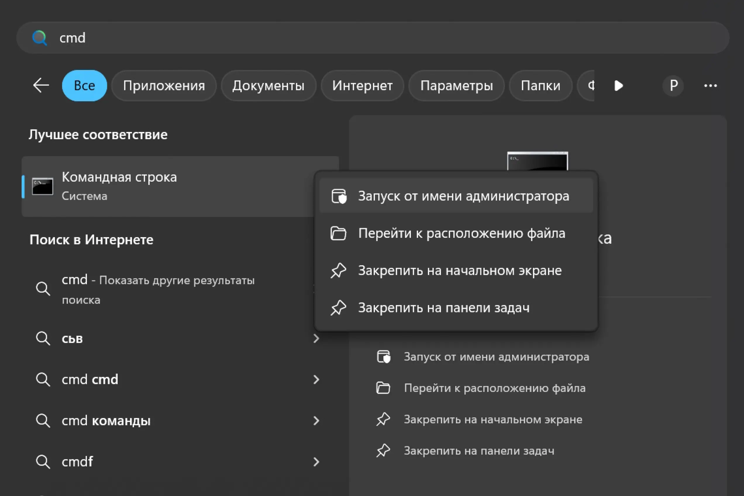 3. Если система пожалуется на то, что у вас нет соответствующих прав, запустите окно командной строки от имени администратора. Для этого введите в строку поиска все те же символы «cmd» (без кавычек), а при появлении в меню пункта «Командная строка» кликните по нему правой кнопкой мыши и выберите опцию «Запуск от имени администратора».