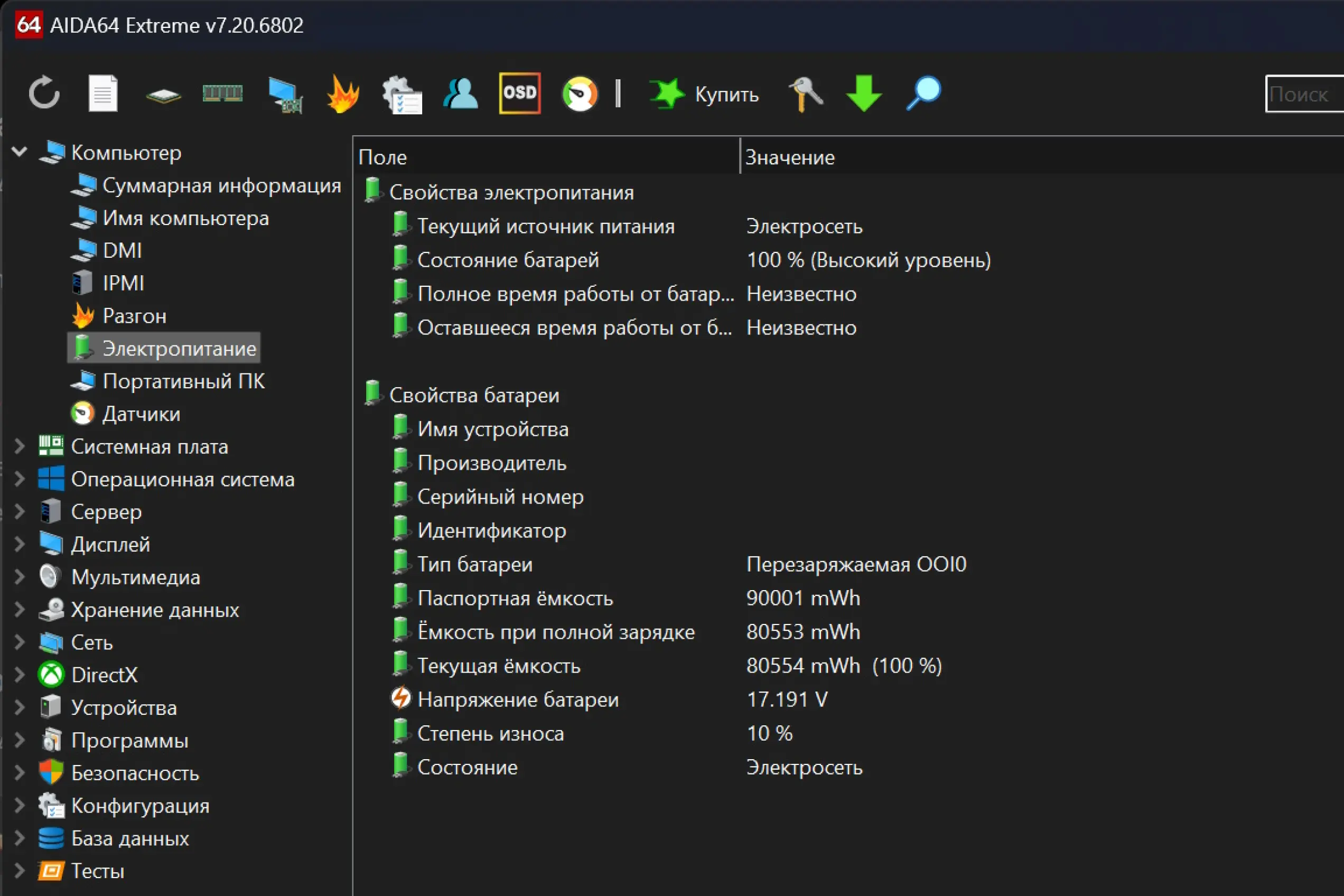 Для проверки батареи ноутбука запустите AIDA64 и обратите внимание на список опций в левой части окна. Выберите раздел «Компьютер», а в выпадающем списке дважды кликните по пункту «Электропитание». После чего в правой части окна отобразятся все актуальные данные о состоянии аккумулятора, включая заявленную емкость, текущий объем при полной зарядке и процент износа.