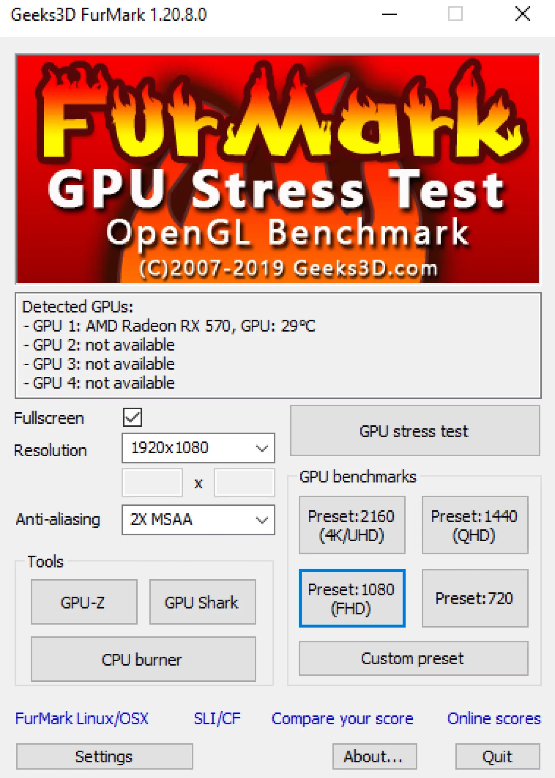 Наверное, самый известный тест для проверки GPU — это FurMark (или «бублик»). Пользоваться им довольно просто. В главном окне утилиты в пункте Resolution выберите желаемое разрешение. Мощные видеокарты вроде RTX 4080/4090, Radeon RX 7900 XT/XTX лучше тестировать в 4K (3840×2160 пикселей). Quad HD (2560×1440 пикселей) подойдет для графических адаптеров уровня RTX 4070/4070 Super или Radeon RX 7800 XT. Менее мощные видеокарты проверяем в разрешении Full HD (1920×1080 пикселей). Пункт Anti-aliasing по умолчанию выключен (off), но для увеличения нагрузки на GPU можно выставить один из трех режимов: 2X MSAA, 4X MSAA, 8X MSAA.
